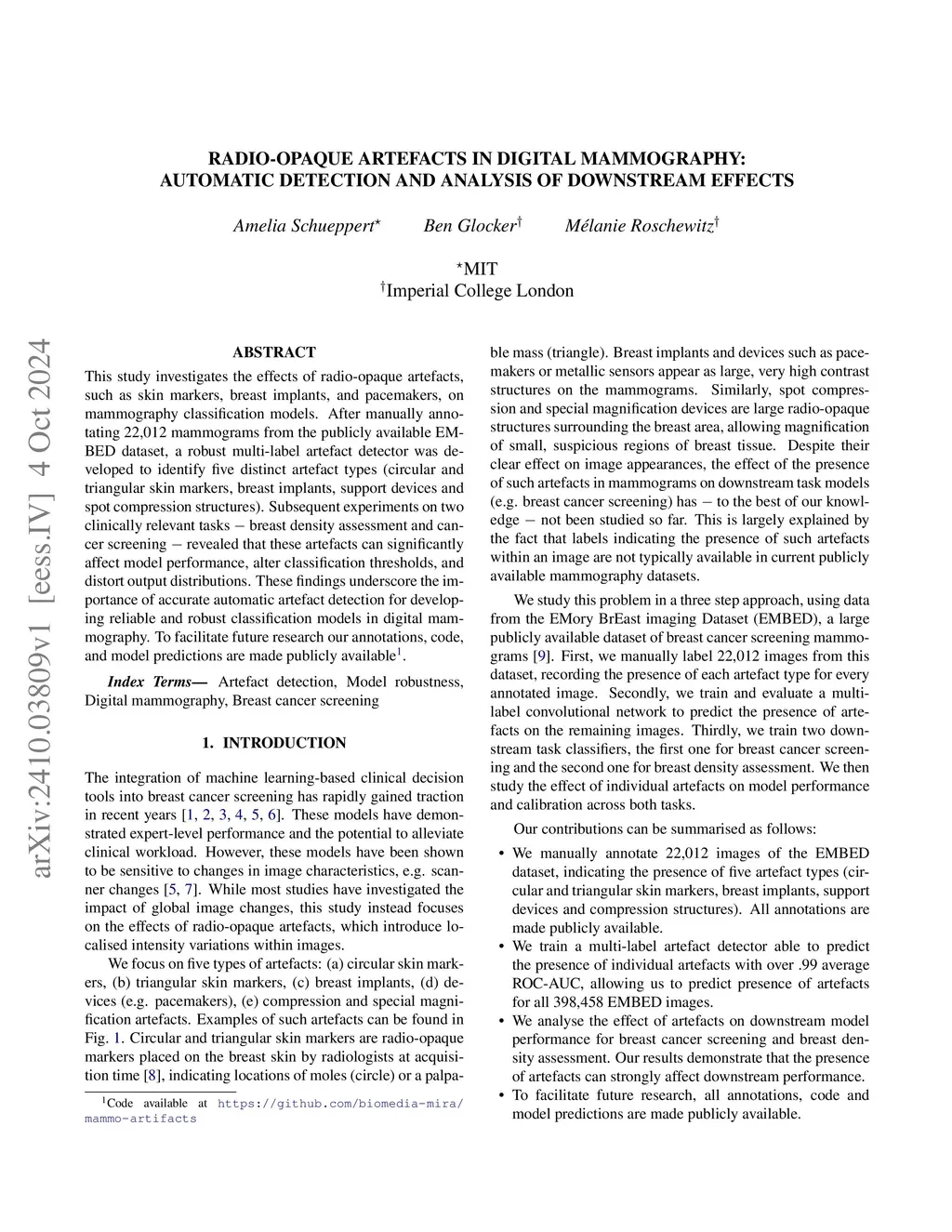 Radio-opaque artefacts in digital mammography: automatic detection and