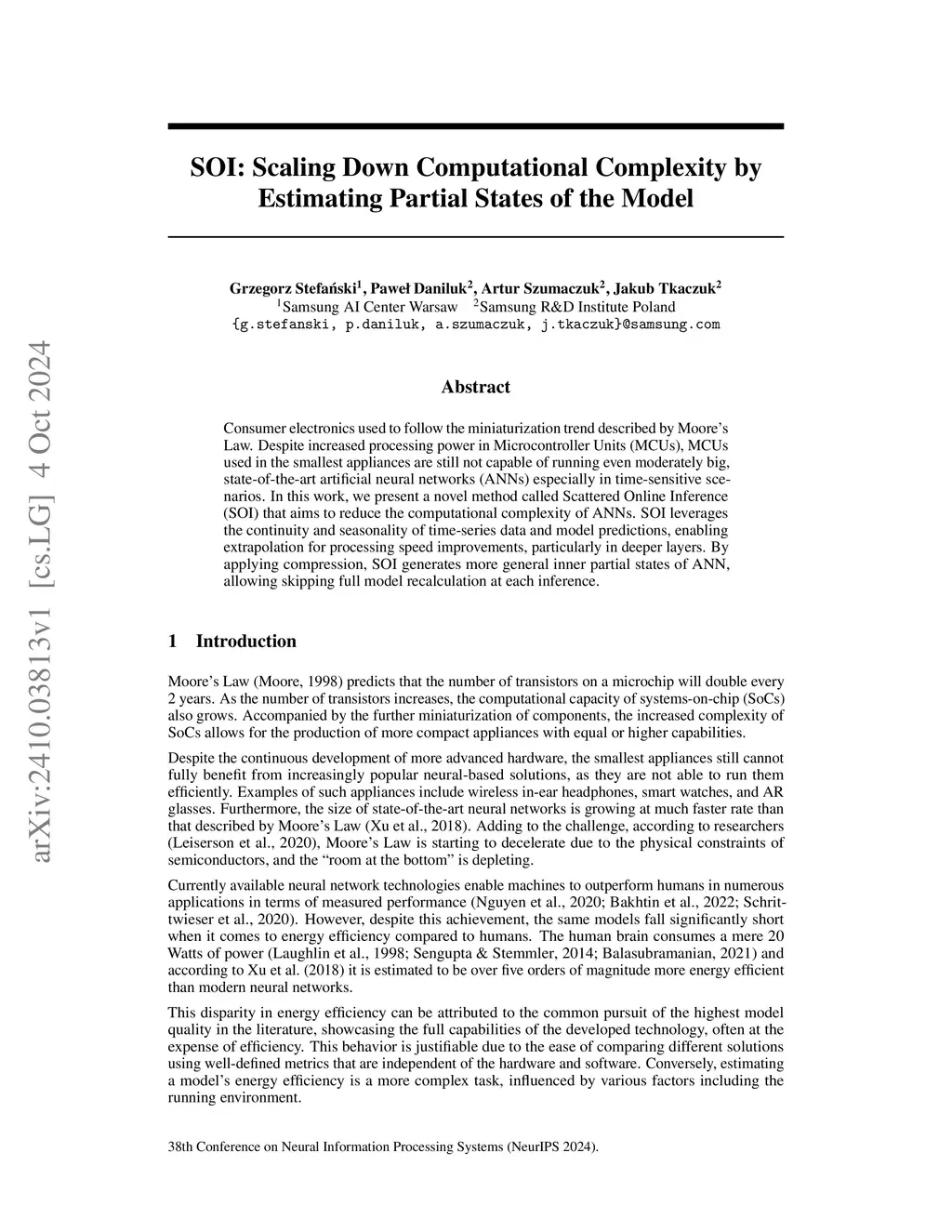 Consumer electronics used to follow the miniaturization trend described by Moore's Law. Despite increased processing power in Microcontroller Units (MCUs), MCUs used in the smallest appliances are still not capable of running even moderately big, state-of-the-art artificial neural networks (ANNs) especially in time-sensitive scenarios. In this work, we present a novel method called Scattered Online Inference (SOI) that aims to reduce the computational complexity of ANNs. SOI leverages the continuity and seasonality of time-series data and model predictions, enabling extrapolation for processing speed improvements, particularly in deeper layers. By applying compression, SOI generates more general inner partial states of ANN, allowing skipping full model recalculation at each inference.