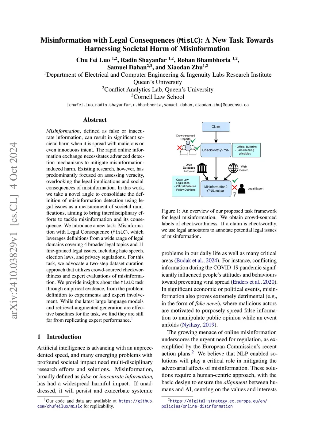 Misinformation with Legal Consequences (MisLC): A New Task Towards