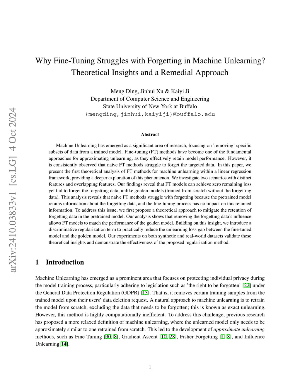 Machine Unlearning has emerged as a significant area of research, focusing on `removing' specific subsets of data from a trained model. Fine-tuning (FT) methods have become one of the fundamental approaches for approximating unlearning, as they effectively retain model performance. However, it is consistently observed that naive FT methods struggle to forget the targeted data. In this paper, we present the first theoretical analysis of FT methods for machine unlearning within a linear regression framework, providing a deeper exploration of this phenomenon. Our analysis reveals that while FT models can achieve zero remaining loss, they fail to forget the forgetting data, as the pretrained model retains its influence and the fine-tuning process does not adequately mitigate it. To address this, we propose a novel Retention-Based Masking (RBM) strategy that constructs a weight saliency map based on the remaining dataset, unlike existing methods that focus on the forgetting dataset. Our theoretical analysis demonstrates that RBM not only significantly improves unlearning accuracy (UA) but also ensures higher retaining accuracy (RA) by preserving overlapping features shared between the forgetting and remaining datasets. Experiments on synthetic and real-world datasets validate our theoretical insights, showing that RBM outperforms existing masking approaches in balancing UA, RA, and disparity metrics.