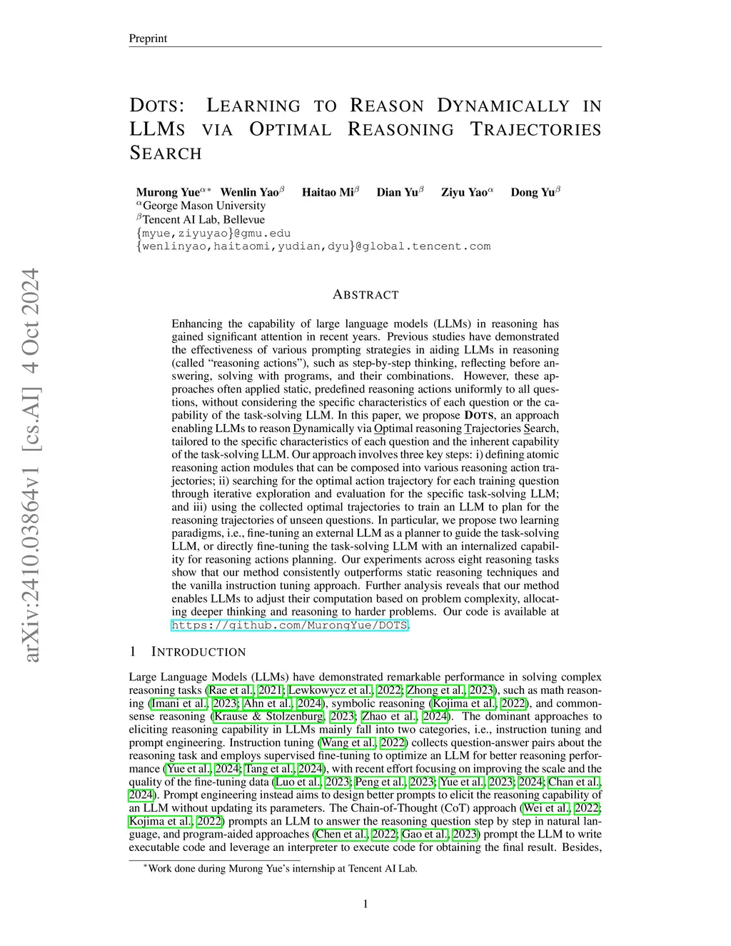 DOTS: Learning to Reason Dynamically in LLMs via Optimal Reasoning Trajectories Search