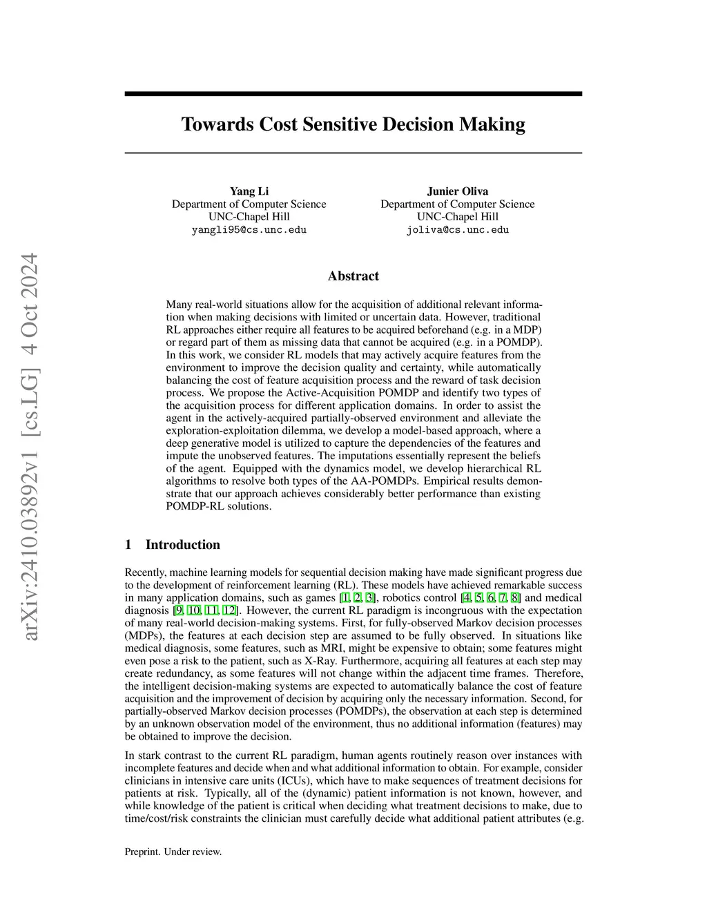Towards Cost Sensitive Decision Making