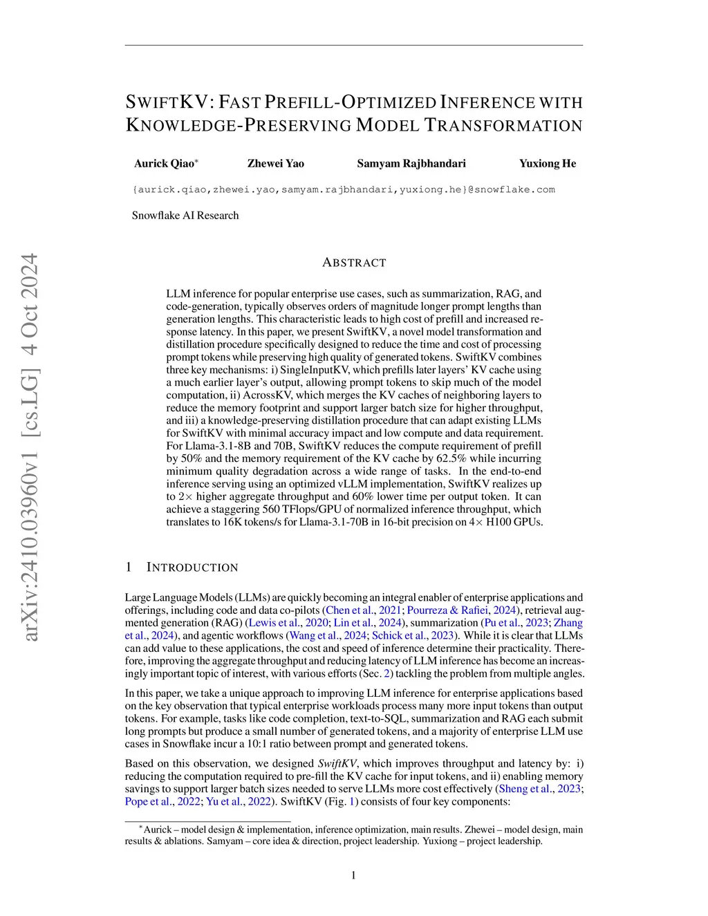 LLM inference for enterprise applications, such as summarization, RAG, and code-generation, typically observe much longer prompt than generations, leading to high prefill cost and response latency. We present SwiftKV, a novel model transformation and distillation procedure targeted at reducing the prefill compute (in FLOPs) of prompt tokens while preserving high generation quality. First, SwiftKV prefills later layers' KV cache using an earlier layer's output, allowing prompt tokens to skip those later layers. Second, SwiftKV employs a lightweight knowledge-preserving distillation procedure that can adapt existing LLMs with minimal accuracy impact. Third, SwiftKV can naturally incorporate KV cache compression to improve inference performance in low-memory scenarios. Our comprehensive experiments show that SwiftKV can effectively reduce prefill computation by 25-50% across several LLM families while incurring minimum quality degradation. In the end-to-end inference serving, SwiftKV realizes up to 2x higher aggregate throughput and 60% lower time per output token. It can achieve a staggering 560 TFlops/GPU of normalized inference throughput, which translates to 16K tokens/s for Llama-3.1-70B. SwiftKV is open-sourced atthis https URL.
