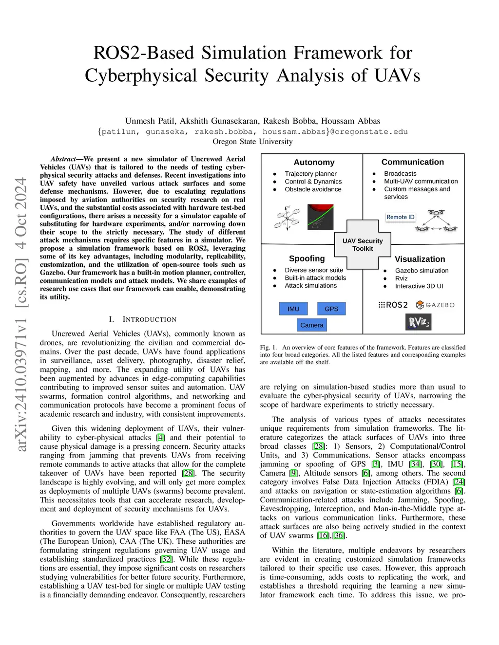 We present a new simulator of Uncrewed Aerial Vehicles (UAVs) that is tailored to the needs of testing cyber-physical security attacks and defenses. Recent investigations into UAV safety have unveiled various attack surfaces and some defense mechanisms. However, due to escalating regulations imposed by aviation authorities on security research on real UAVs, and the substantial costs associated with hardware test-bed configurations, there arises a necessity for a simulator capable of substituting for hardware experiments, and/or narrowing down their scope to the strictly necessary. The study of different attack mechanisms requires specific features in a simulator. We propose a simulation framework based on ROS2, leveraging some of its key advantages, including modularity, replicability, customization, and the utilization of open-source tools such as Gazebo. Our framework has a built-in motion planner, controller, communication models and attack models. We share examples of research use cases that our framework can enable, demonstrating its utility.