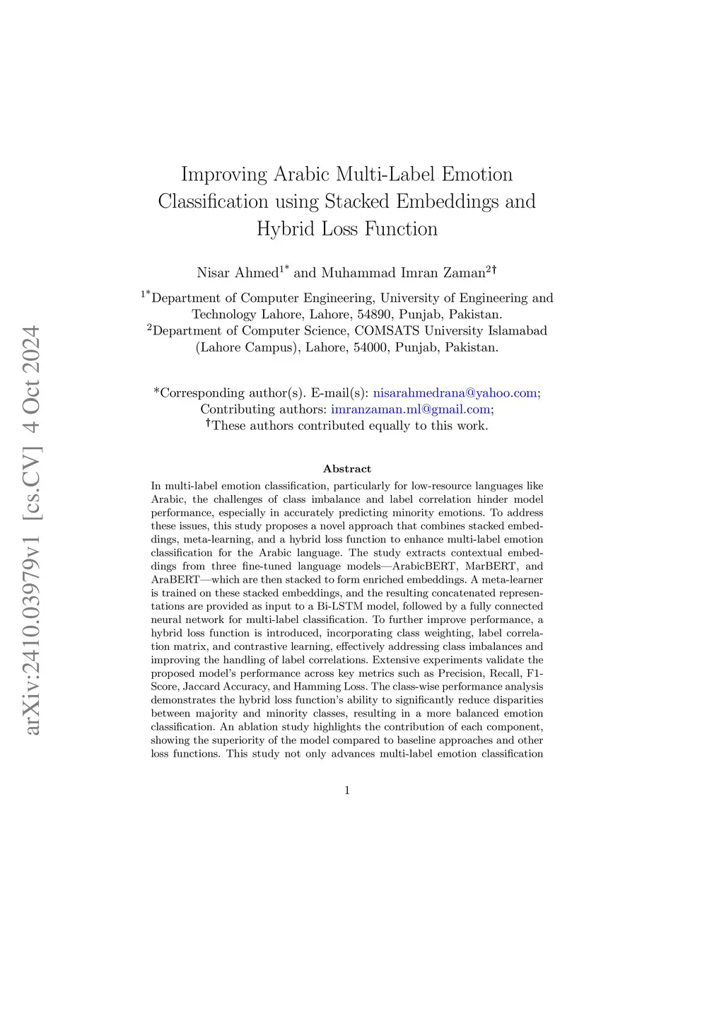 In multi-label emotion classification, particularly for low-resource languages like Arabic, the challenges of class imbalance and label correlation hinder model performance, especially in accurately predicting minority emotions. To address these issues, this study proposes a novel approach that combines stacked embeddings, meta-learning, and a hybrid loss function to enhance multi-label emotion classification for the Arabic language. The study extracts contextual embeddings from three fine-tuned language models-ArabicBERT, MarBERT, and AraBERT-which are then stacked to form enriched embeddings. A meta-learner is trained on these stacked embeddings, and the resulting concatenated representations are provided as input to a Bi-LSTM model, followed by a fully connected neural network for multi-label classification. To further improve performance, a hybrid loss function is introduced, incorporating class weighting, label correlation matrix, and contrastive learning, effectively addressing class imbalances and improving the handling of label correlations. Extensive experiments validate the proposed model's performance across key metrics such as Precision, Recall, F1-Score, Jaccard Accuracy, and Hamming Loss. The class-wise performance analysis demonstrates the hybrid loss function's ability to significantly reduce disparities between majority and minority classes, resulting in a more balanced emotion classification. An ablation study highlights the contribution of each component, showing the superiority of the model compared to baseline approaches and other loss functions. This study not only advances multi-label emotion classification for Arabic but also presents a generalizable framework that can be adapted to other languages and domains, providing a significant step forward in addressing the challenges of low-resource emotion classification tasks.