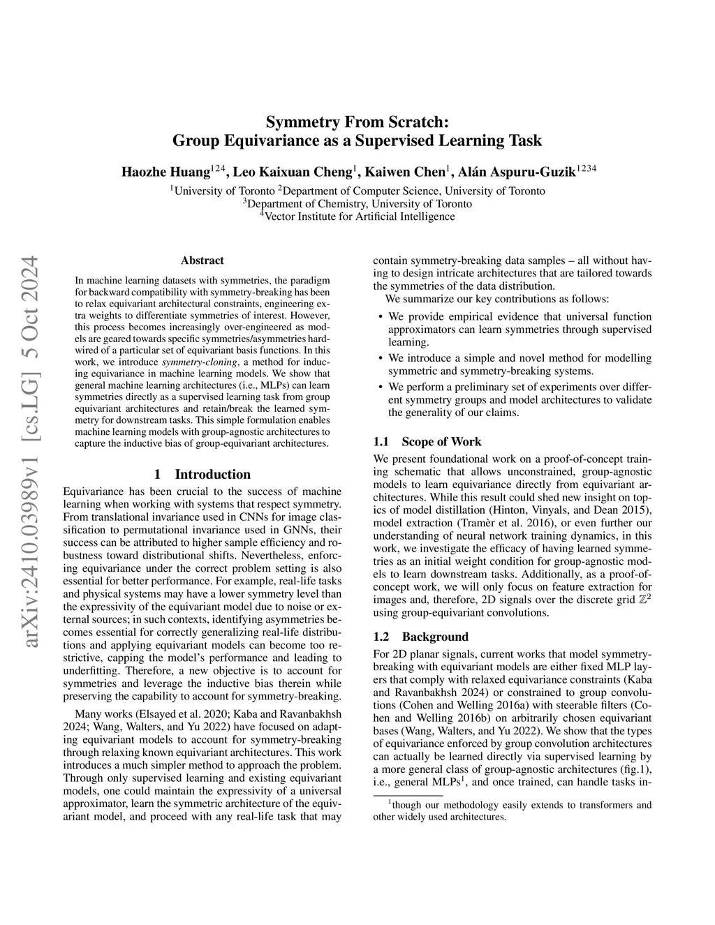 In machine learning datasets with symmetries, the paradigm for backward compatibility with symmetry-breaking has been to relax equivariant architectural constraints, engineering extra weights to differentiate symmetries of interest. However, this process becomes increasingly over-engineered as models are geared towards specific symmetries/asymmetries hardwired of a particular set of equivariant basis functions. In this work, we introduce symmetry-cloning, a method for inducing equivariance in machine learning models. We show that general machine learning architectures (i.e., MLPs) can learn symmetries directly as a supervised learning task from group equivariant architectures and retain/break the learned symmetry for downstream tasks. This simple formulation enables machine learning models with group-agnostic architectures to capture the inductive bias of group-equivariant architectures.