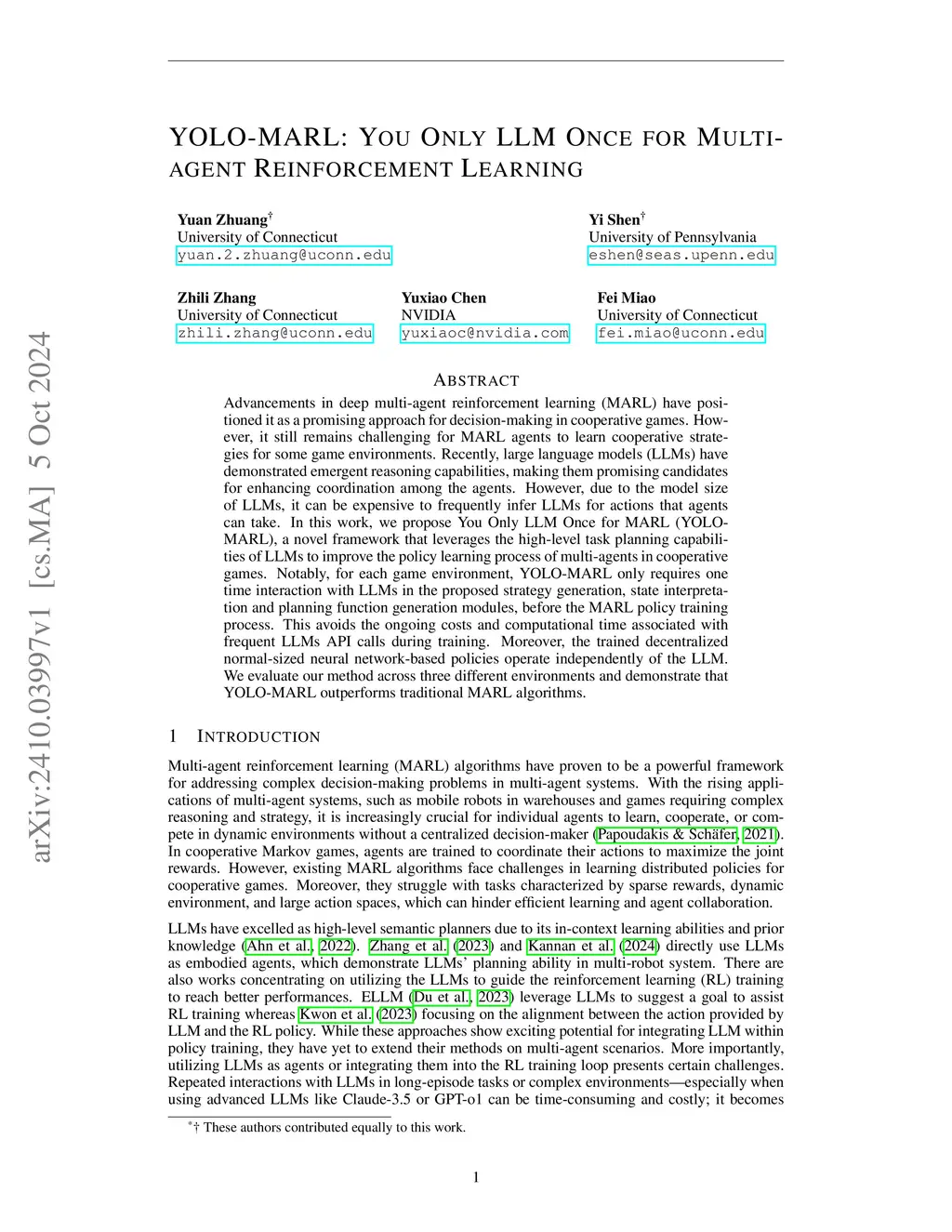 YOLO-MARL: You Only LLM Once for Multi-agent Reinforcement Learning