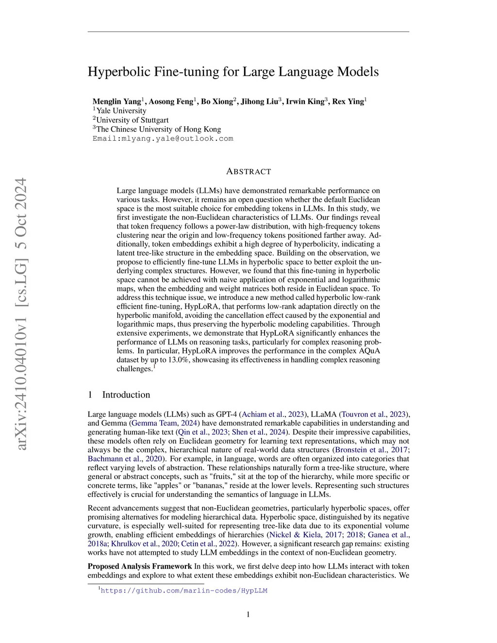 Large language models (LLMs) have demonstrated remarkable performance across various tasks. However, it remains an open question whether the default Euclidean space is the most suitable choice for LLMs. In this study, we investigate the geometric characteristics of LLMs, focusing specifically on tokens and their embeddings. Our findings reveal that token frequency follows a power-law distribution, where high-frequency tokens (e.g., the, that ) constitute the minority, while low-frequency tokens (e.g., apple, dog) constitute the majority. Furthermore, high-frequency tokens cluster near the origin, whereas low-frequency tokens are positioned farther away in the embedding space. Additionally, token embeddings exhibit hyperbolic characteristics, indicating a latent tree-like structure within the embedding space. Motivated by these observations, we propose HypLoRA, an efficient fine-tuning approach that operates in hyperbolic space to exploit these underlying hierarchical structures better. HypLoRA performs low-rank adaptation directly in hyperbolic space, thereby preserving hyperbolic modeling capabilities throughout the fine-tuning process. Extensive experiments across various base models and reasoning benchmarks, specifically arithmetic and commonsense reasoning tasks, demonstrate that HypLoRA substantially improves LLM performance.