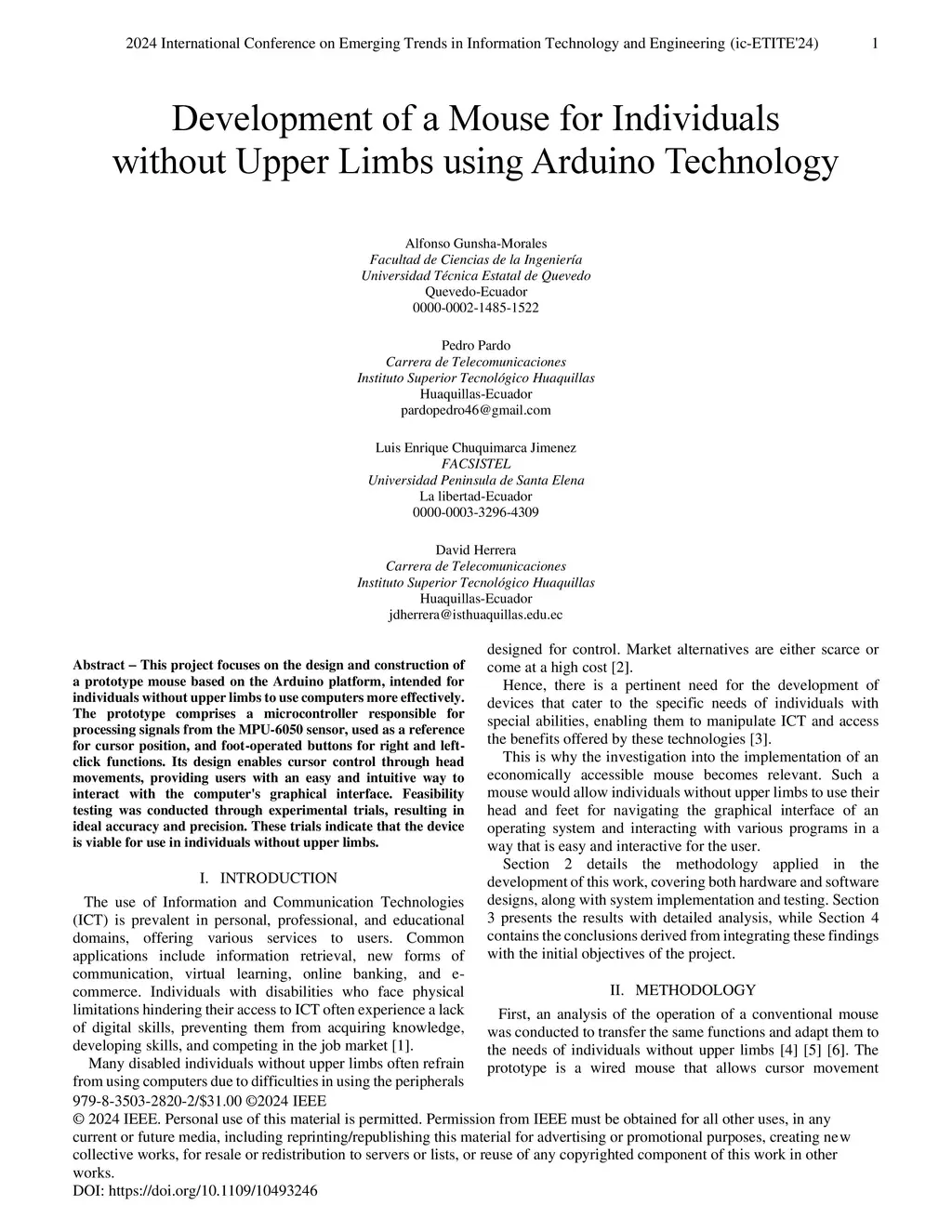 This project focuses on the design and construction of a prototype mouse based on the Arduino platform, intended for individuals without upper limbs to use computers more effectively. The prototype comprises a microcontroller responsible for processing signals from the MPU-6050 sensor, used as a reference for cursor position, and foot-operated buttons for right and left-click functions. Its design enables cursor control through head movements, providing users with an easy and intuitive way to interact with the computer's graphical interface. Feasibility testing was conducted through experimental trials, resulting in ideal accuracy and precision. These trials indicate that the device is viable for use in individuals without upper limbs.