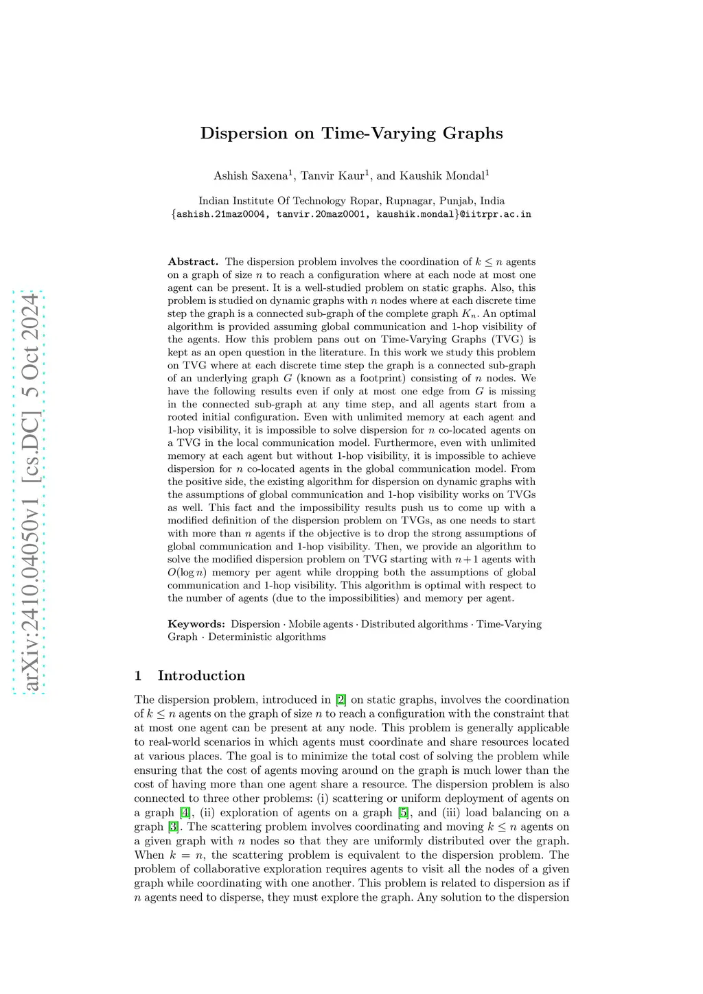 The dispersion involves the coordination of agents on a graph of size to reach a configuration where at each node at most one agent can be present. It is a well-studied problem. Also, this problem is studied on dynamic graphs with nodes where at each discrete time step the graph is a connected sub-graph of the complete graph . An optimal algorithm is provided assuming global communication and 1-hop visibility of the agents. How this problem pans out on Time-Varying Graphs (TVG) is an open question in the literature. In this work we study this problem on TVG where at each discrete time step the graph is a connected sub-graph of an underlying graph (known as a footprint) consisting of nodes. We have the following results even if only one edge from is missing in the connected sub-graph at any time step and all agents start from a rooted initial configuration. Even with unlimited memory at each agent and 1-hop visibility, it is impossible to solve dispersion for co-located agents on a TVG in the local communication model. Furthermore, even with unlimited memory at each agent but without 1-hop visibility, it is impossible to achieve dispersion for co-located agents in the global communication model. From the positive side, the existing algorithm for dispersion on dynamic graphs with the assumptions of global communication and 1-hop visibility works on TVGs as well. This fact and the impossibility results push us to come up with a modified definition of the dispersion problem on TVGs, as one needs to start with more than agents if the objective is to drop the strong assumptions of global communication and 1-hop visibility. Then, we provide an algorithm to solve the modified dispersion problem on TVG starting with agents with memory per agent while dropping both the assumptions of global communication and 1-hop visibility.