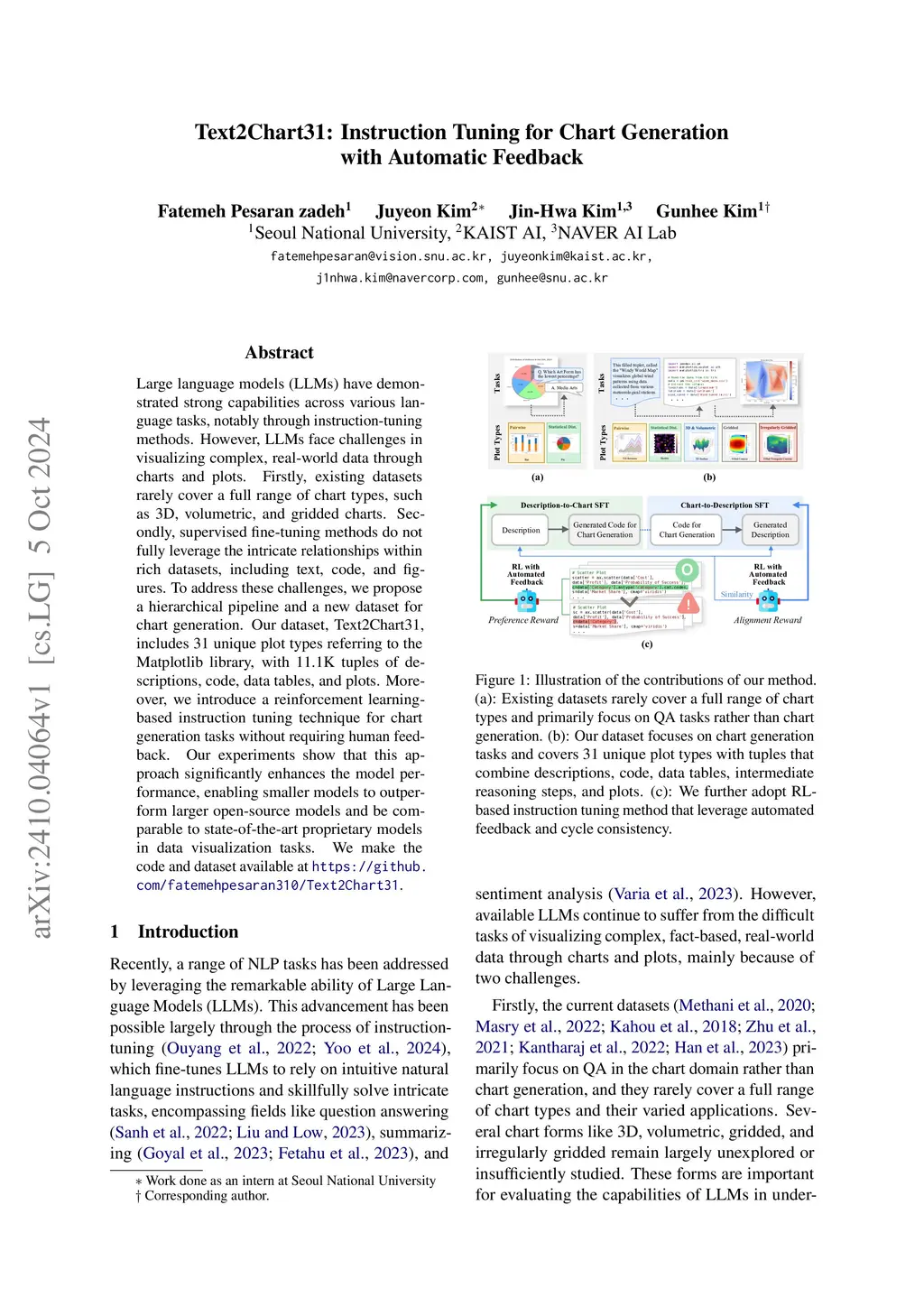 Large language models (LLMs) have demonstrated strong capabilities across various language tasks, notably through instruction-tuning methods. However, LLMs face challenges in visualizing complex, real-world data through charts and plots. Firstly, existing datasets rarely cover a full range of chart types, such as 3D, volumetric, and gridded charts. Secondly, supervised fine-tuning methods do not fully leverage the intricate relationships within rich datasets, including text, code, and figures. To address these challenges, we propose a hierarchical pipeline and a new dataset for chart generation. Our dataset, Text2Chart31, includes 31 unique plot types referring to the Matplotlib library, with 11.1K tuples of descriptions, code, data tables, and plots. Moreover, we introduce a reinforcement learning-based instruction tuning technique for chart generation tasks without requiring human feedback. Our experiments show that this approach significantly enhances the model performance, enabling smaller models to outperform larger open-source models and be comparable to state-of-the-art proprietary models in data visualization tasks. We make the code and dataset available atthis https URL.