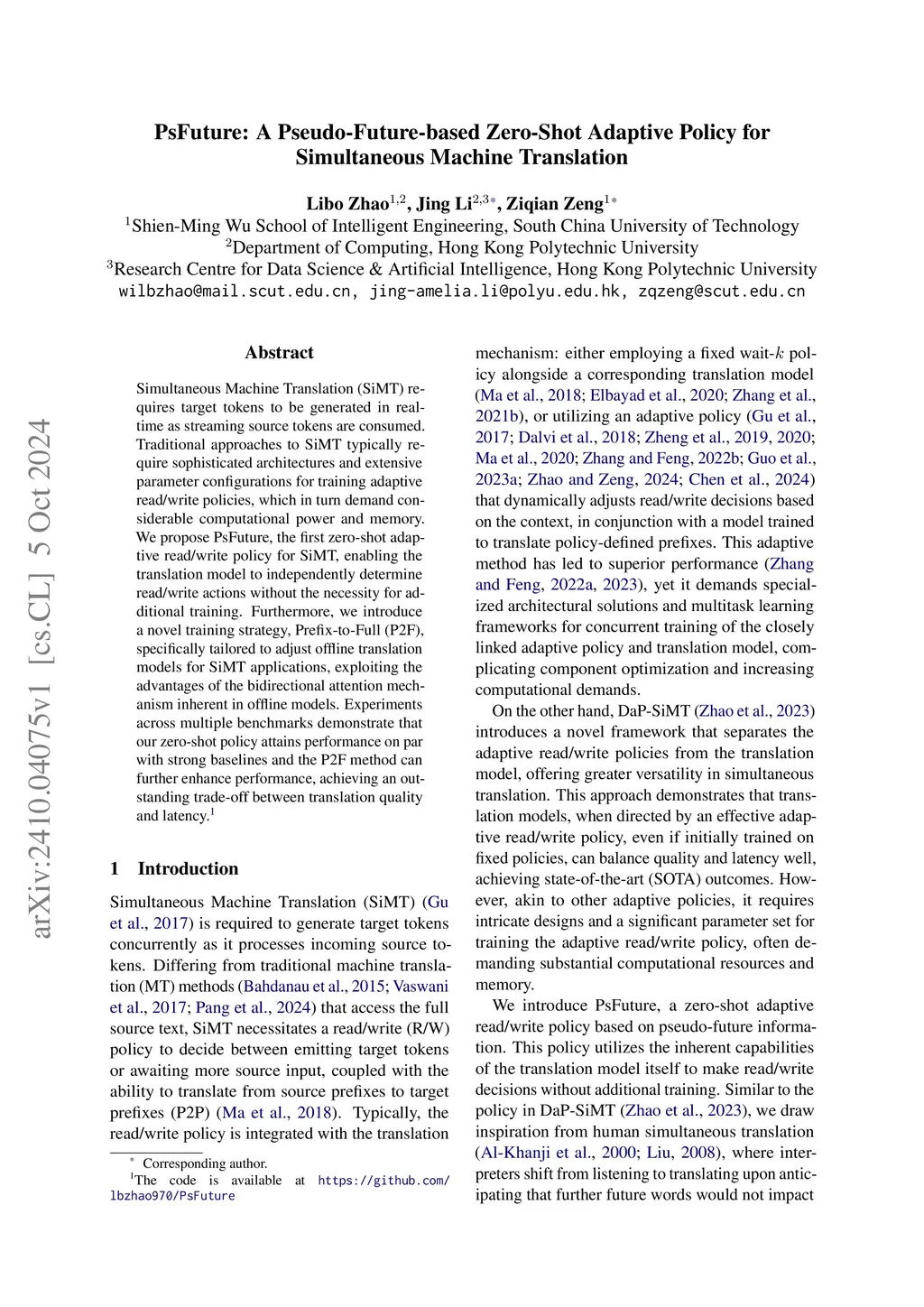 Simultaneous Machine Translation (SiMT) requires target tokens to be generated in real-time as streaming source tokens are consumed. Traditional approaches to SiMT typically require sophisticated architectures and extensive parameter configurations for training adaptive read/write policies, which in turn demand considerable computational power and memory. We propose PsFuture, the first zero-shot adaptive read/write policy for SiMT, enabling the translation model to independently determine read/write actions without the necessity for additional training. Furthermore, we introduce a novel training strategy, Prefix-to-Full (P2F), specifically tailored to adjust offline translation models for SiMT applications, exploiting the advantages of the bidirectional attention mechanism inherent in offline models. Experiments across multiple benchmarks demonstrate that our zero-shot policy attains performance on par with strong baselines and the P2F method can further enhance performance, achieving an outstanding trade-off between translation quality and latency.