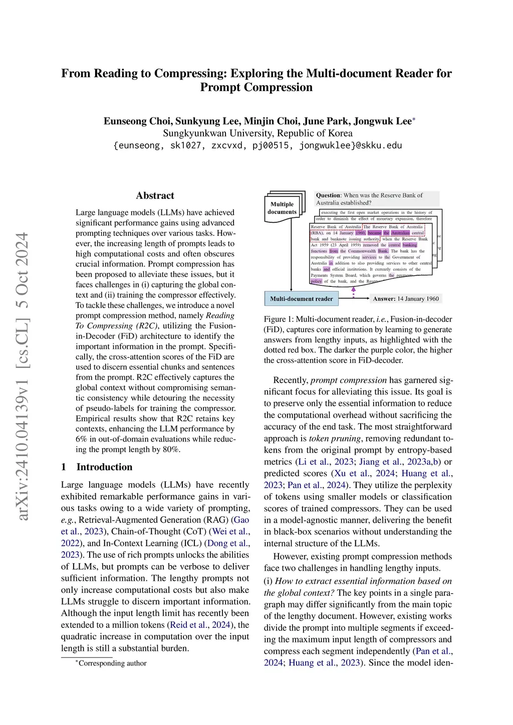 Large language models (LLMs) have achieved significant performance gains using advanced prompting techniques over various tasks. However, the increasing length of prompts leads to high computational costs and often obscures crucial information. Prompt compression has been proposed to alleviate these issues, but it faces challenges in (i) capturing the global context and (ii) training the compressor effectively. To tackle these challenges, we introduce a novel prompt compression method, namely Reading To Compressing (R2C), utilizing the Fusion-in-Decoder (FiD) architecture to identify the important information in the prompt. Specifically, the cross-attention scores of the FiD are used to discern essential chunks and sentences from the prompt. R2C effectively captures the global context without compromising semantic consistency while detouring the necessity of pseudo-labels for training the compressor. Empirical results show that R2C retains key contexts, enhancing the LLM performance by 6% in out-of-domain evaluations while reducing the prompt length by 80%.