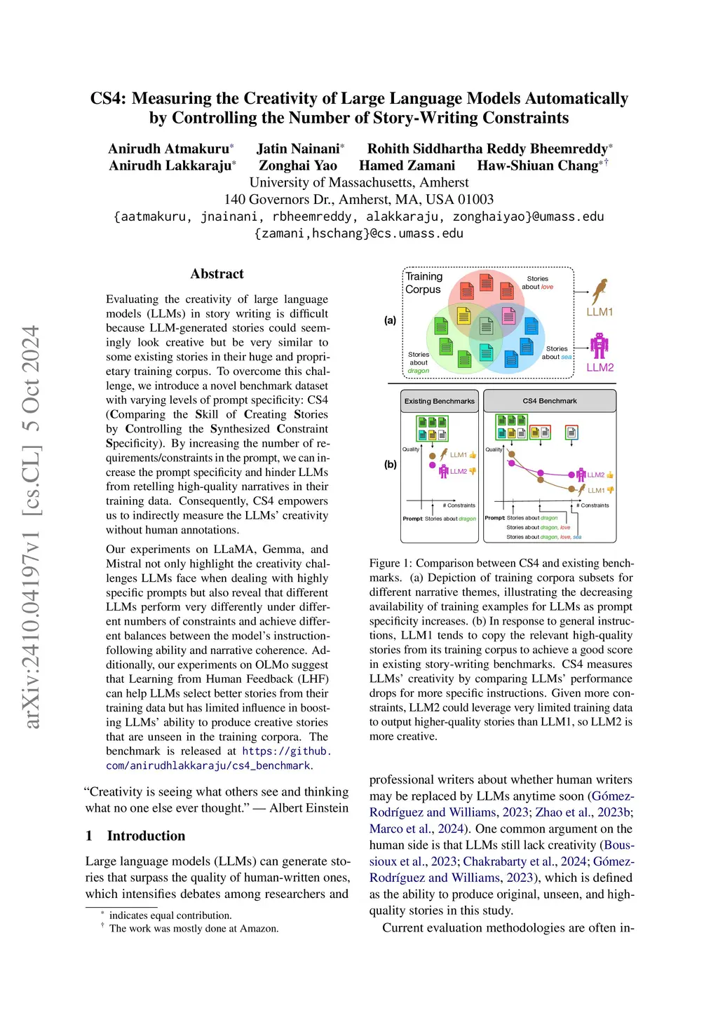 Evaluating the creativity of large language models (LLMs) in story writing is difficult because LLM-generated stories could seemingly look creative but be very similar to some existing stories in their huge and proprietary training corpus. To overcome this challenge, we introduce a novel benchmark dataset with varying levels of prompt specificity: CS4 (omparing the kill of reating tories by ontrolling the ynthesized onstraint pecificity). By increasing the number of requirements/constraints in the prompt, we can increase the prompt specificity and hinder LLMs from retelling high-quality narratives in their training data. Consequently, CS4 empowers us to indirectly measure the LLMs' creativity without human annotations. Our experiments on LLaMA, Gemma, and Mistral not only highlight the creativity challenges LLMs face when dealing with highly specific prompts but also reveal that different LLMs perform very differently under different numbers of constraints and achieve different balances between the model's instruction-following ability and narrative coherence. Additionally, our experiments on OLMo suggest that Learning from Human Feedback (LHF) can help LLMs select better stories from their training data but has limited influence in boosting LLMs' ability to produce creative stories that are unseen in the training corpora. The benchmark is released at https://github.com/anirudhlakkaraju/cs4_benchmark.