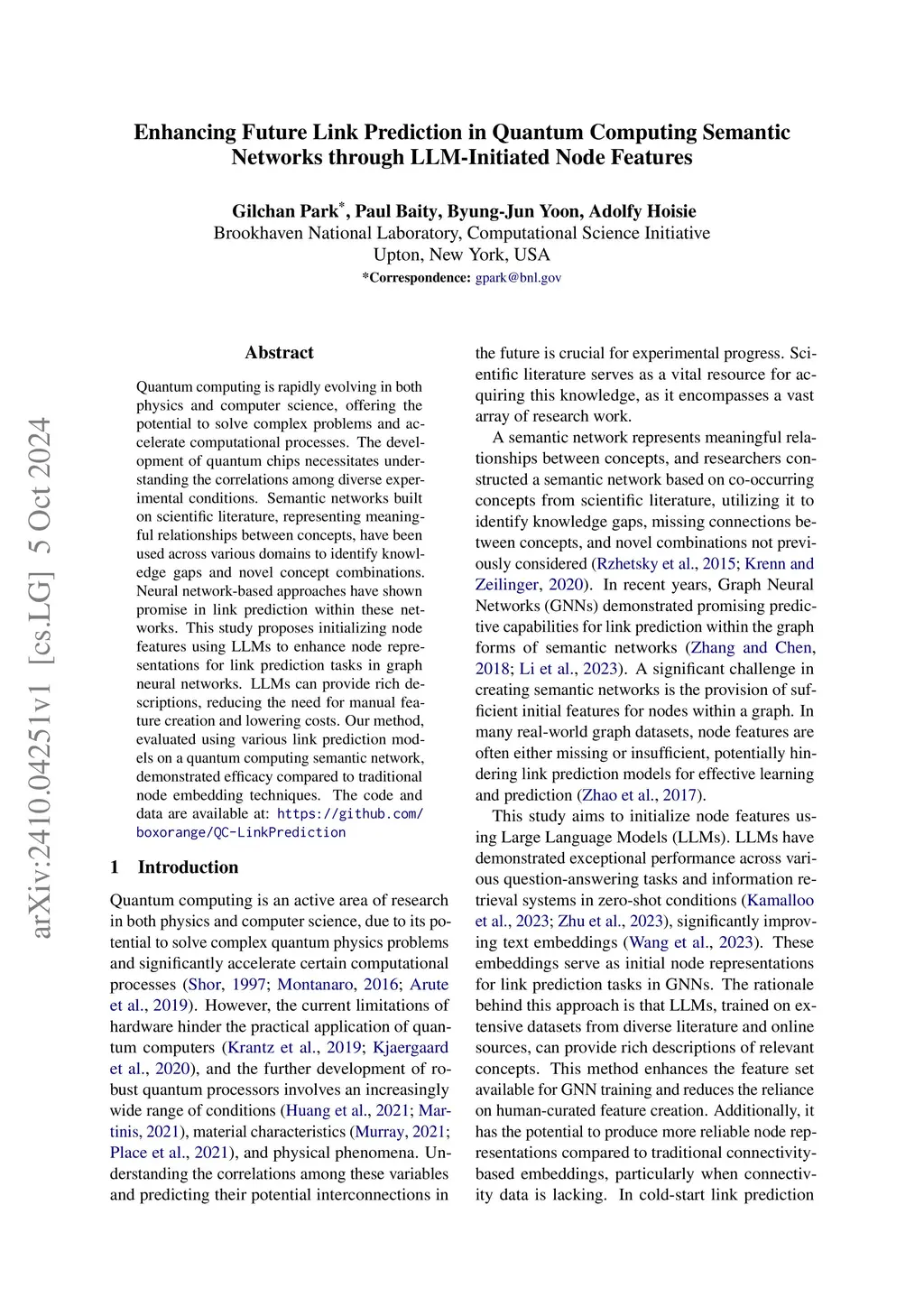 Quantum computing is rapidly evolving in both physics and computer science, offering the potential to solve complex problems and accelerate computational processes. The development of quantum chips necessitates understanding the correlations among diverse experimental conditions. Semantic networks built on scientific literature, representing meaningful relationships between concepts, have been used across various domains to identify knowledge gaps and novel concept combinations. Neural network-based approaches have shown promise in link prediction within these networks. This study proposes initializing node features using LLMs to enhance node representations for link prediction tasks in graph neural networks. LLMs can provide rich descriptions, reducing the need for manual feature creation and lowering costs. Our method, evaluated using various link prediction models on a quantum computing semantic network, demonstrated efficacy compared to traditional node embedding techniques.
