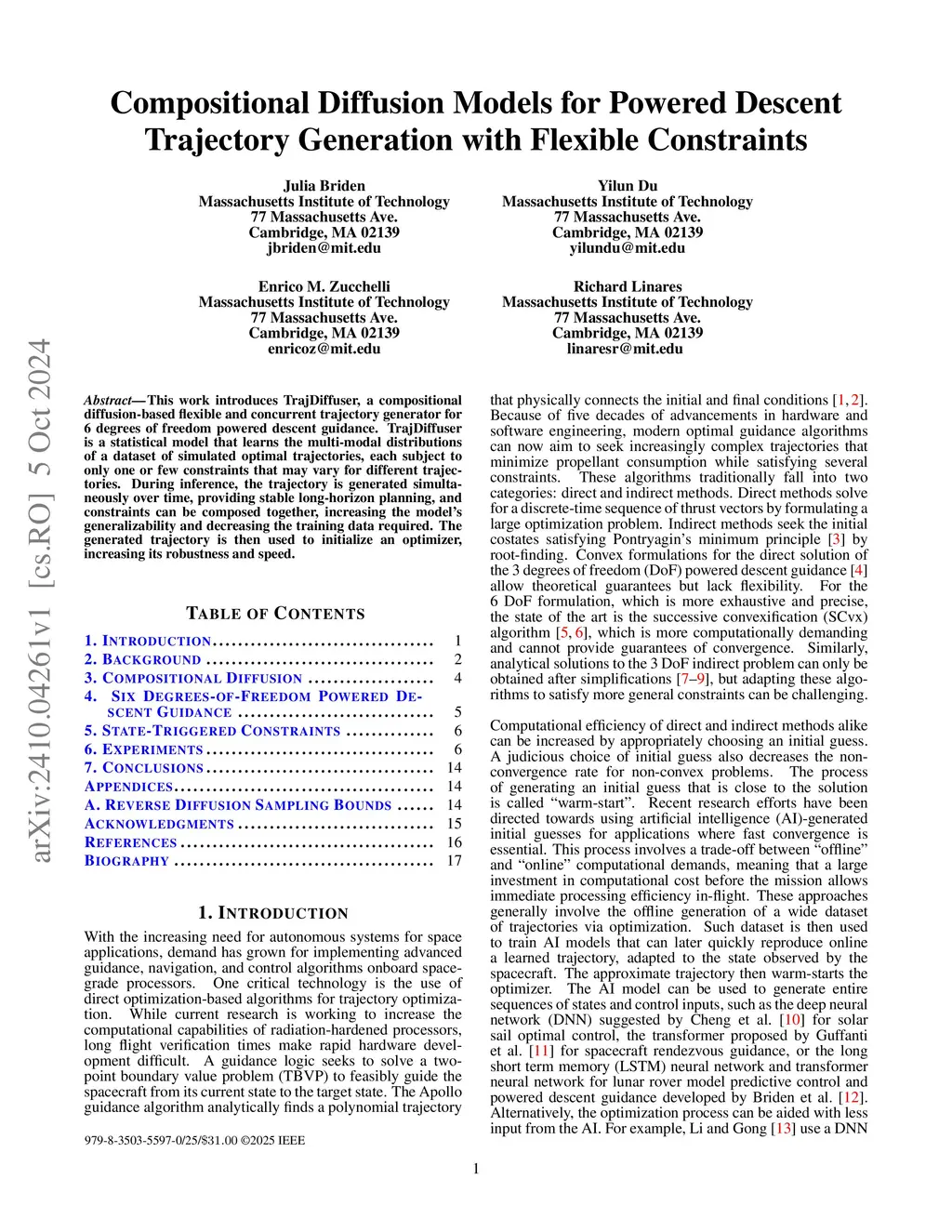 This work introduces TrajDiffuser, a compositional diffusion-based flexible and concurrent trajectory generator for 6 degrees of freedom powered descent guidance. TrajDiffuser is a statistical model that learns the multi-modal distributions of a dataset of simulated optimal trajectories, each subject to only one or few constraints that may vary for different trajectories. During inference, the trajectory is generated simultaneously over time, providing stable long-horizon planning, and constraints can be composed together, increasing the model's generalizability and decreasing the training data required. The generated trajectory is then used to initialize an optimizer, increasing its robustness and speed.