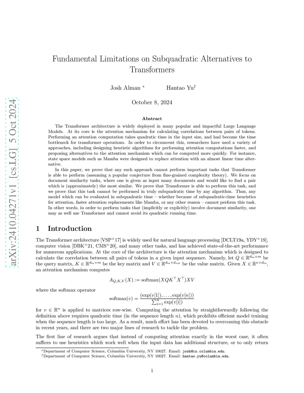 The Transformer architecture is widely deployed in many popular and impactful Large Language Models. At its core is the attention mechanism for calculating correlations between pairs of tokens. Performing an attention computation takes quadratic time in the input size, and had become the time bottleneck for transformer operations. In order to circumvent this, researchers have used a variety of approaches, including designing heuristic algorithms for performing attention computations faster, and proposing alternatives to the attention mechanism which can be computed more quickly. For instance, state space models such as Mamba were designed to replace attention with an almost linear time alternative.In this paper, we prove that any such approach cannot perform important tasks that Transformer is able to perform (assuming a popular conjecture from fine-grained complexity theory). We focus on document similarity tasks, where one is given as input many documents and would like to find a pair which is (approximately) the most similar. We prove that Transformer is able to perform this task, and we prove that this task cannot be performed in truly subquadratic time by any algorithm. Thus, any model which can be evaluated in subquadratic time - whether because of subquadratic-time heuristics for attention, faster attention replacements like Mamba, or any other reason - cannot perform this task. In other words, in order to perform tasks that (implicitly or explicitly) involve document similarity, one may as well use Transformer and cannot avoid its quadratic running time.