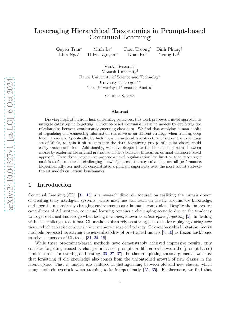 Humans perceive the world as a series of sequential events, which can be hierarchically organized with different levels of abstraction based on conceptual knowledge. Drawing inspiration from human learning behaviors, this work proposes a novel approach to mitigate catastrophic forgetting in Prompt-based Continual Learning models by exploiting the relationships between continuously emerging class data. We find that applying human habits of organizing and connecting information can serve as an efficient strategy when training deep learning models. Specifically, by building a hierarchical tree structure based on the expanding set of labels, we gain fresh insights into the data, identifying groups of similar classes could easily cause confusion. Additionally, we delve deeper into the hidden connections between classes by exploring the original pretrained model's behavior through an optimal transport-based approach. From these insights, we propose a novel regularization loss function that encourages models to focus more on challenging knowledge areas, thereby enhancing overall performance. Experimentally, our method demonstrated significant superiority over the most robust state-of-the-art models on various benchmarks.