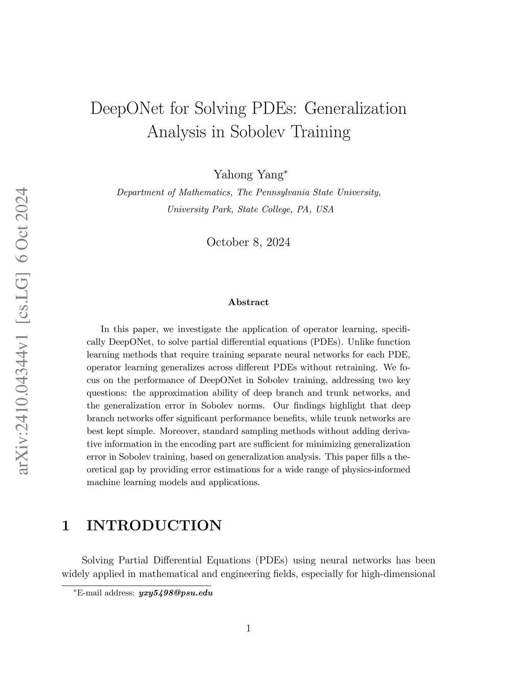 In this paper, we investigate the applications of operator learning, specifically DeepONet, for solving nonlinear partial differential equations (PDEs). Unlike conventional function learning methods that require training separate neural networks for each PDE, operator learning enables generalization across different PDEs without retraining. This study examines the performance of DeepONet in physics-informed training, focusing on two key aspects: (1) the approximation capabilities of deep branch and trunk networks, and (2) the generalization error in Sobolev norms. Our results show that complex branch networks provide substantial performance gains, while trunk networks are most effective when kept relatively simple. Furthermore, we derive a bound on the generalization error of DeepONet for solving nonlinear PDEs by analyzing the Rademacher complexity of its derivatives in terms of pseudo-dimension. This work bridges a critical theoretical gap by delivering rigorous error estimates. This paper fills a theoretical gap by providing error estimates for a wide range of physics-informed machine learning models and applications.