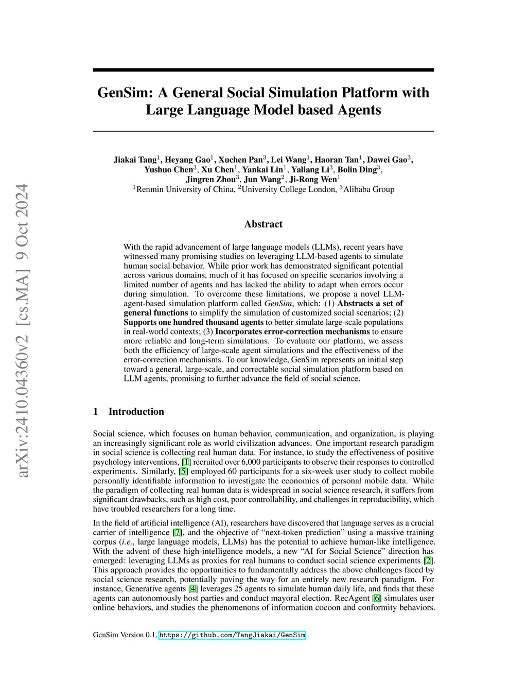 With the rapid advancement of large language models (LLMs), recent years have witnessed many promising studies on leveraging LLM-based agents to simulate human social behavior. While prior work has demonstrated significant potential across various domains, much of it has focused on specific scenarios involving a limited number of agents and has lacked the ability to adapt when errors occur during simulation. To overcome these limitations, we propose a novel LLM-agent-based simulation platform called \textit{GenSim}, which: (1) \textbf{Abstracts a set of general functions} to simplify the simulation of customized social scenarios; (2) \textbf{Supports one hundred thousand agents} to better simulate large-scale populations in real-world contexts; (3) \textbf{Incorporates error-correction mechanisms} to ensure more reliable and long-term simulations. To evaluate our platform, we assess both the efficiency of large-scale agent simulations and the effectiveness of the error-correction mechanisms. To our knowledge, GenSim represents an initial step toward a general, large-scale, and correctable social simulation platform based on LLM agents, promising to further advance the field of social science.