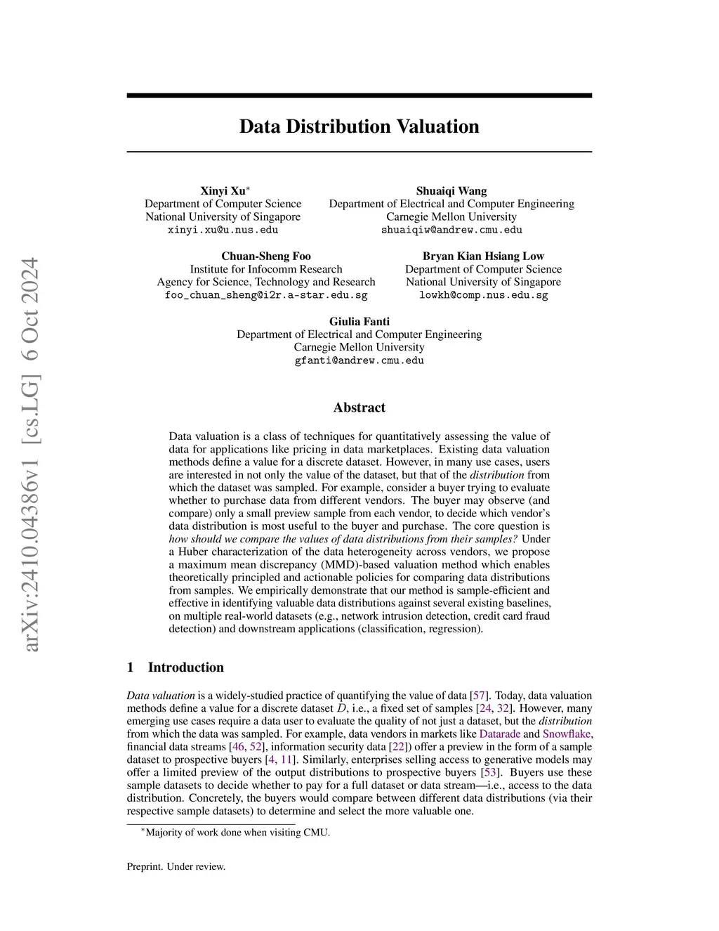 Data valuation is a class of techniques for quantitatively assessing the value of data for applications like pricing in data marketplaces. Existing data valuation methods define a value for a discrete dataset. However, in many use cases, users are interested in not only the value of the dataset, but that of the distribution from which the dataset was sampled. For example, consider a buyer trying to evaluate whether to purchase data from different vendors. The buyer may observe (and compare) only a small preview sample from each vendor, to decide which vendor's data distribution is most useful to the buyer and purchase. The core question is how should we compare the values of data distributions from their samples? Under a Huber characterization of the data heterogeneity across vendors, we propose a maximum mean discrepancy (MMD)-based valuation method which enables theoretically principled and actionable policies for comparing data distributions from samples. We empirically demonstrate that our method is sample-efficient and effective in identifying valuable data distributions against several existing baselines, on multiple real-world datasets (e.g., network intrusion detection, credit card fraud detection) and downstream applications (classification, regression).