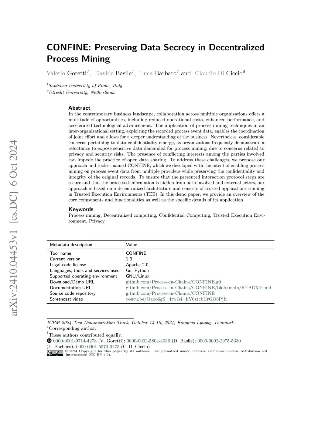 In the contemporary business landscape, collaboration across multiple organizations offers a multitude of opportunities, including reduced operational costs, enhanced performance, and accelerated technological advancement. The application of process mining techniques in an inter-organizational setting, exploiting the recorded process event data, enables the coordination of joint effort and allows for a deeper understanding of the business. Nevertheless, considerable concerns pertaining to data confidentiality emerge, as organizations frequently demonstrate a reluctance to expose sensitive data demanded for process mining, due to concerns related to privacy and security risks. The presence of conflicting interests among the parties involved can impede the practice of open data sharing. To address these challenges, we propose our approach and toolset named CONFINE, which we developed with the intent of enabling process mining on process event data from multiple providers while preserving the confidentiality and integrity of the original records. To ensure that the presented interaction protocol steps are secure and that the processed information is hidden from both involved and external actors, our approach is based on a decentralized architecture and consists of trusted applications running in Trusted Execution Environments (TEE). In this demo paper, we provide an overview of the core components and functionalities as well as the specific details of its application.
