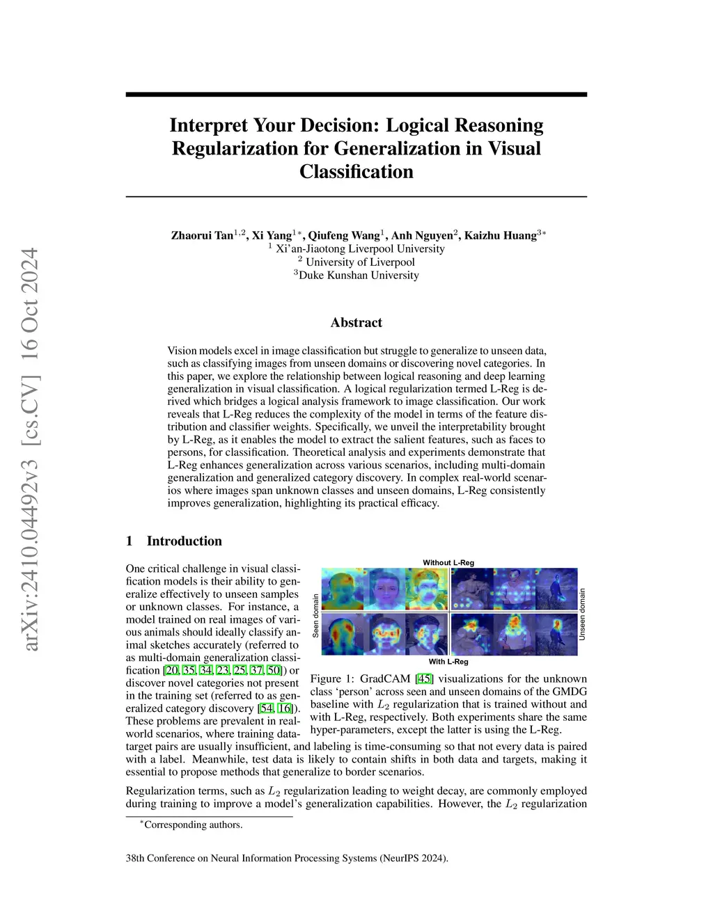 Vision models excel in image classification but struggle to generalize to unseen data, such as classifying images from unseen domains or discovering novel categories. In this paper, we explore the relationship between logical reasoning and deep learning generalization in visual classification. A logical regularization termed L-Reg is derived which bridges a logical analysis framework to image classification. Our work reveals that L-Reg reduces the complexity of the model in terms of the feature distribution and classifier weights. Specifically, we unveil the interpretability brought by L-Reg, as it enables the model to extract the salient features, such as faces to persons, for classification. Theoretical analysis and experiments demonstrate that L-Reg enhances generalization across various scenarios, including multi-domain generalization and generalized category discovery. In complex real-world scenarios where images span unknown classes and unseen domains, L-Reg consistently improves generalization, highlighting its practical efficacy.