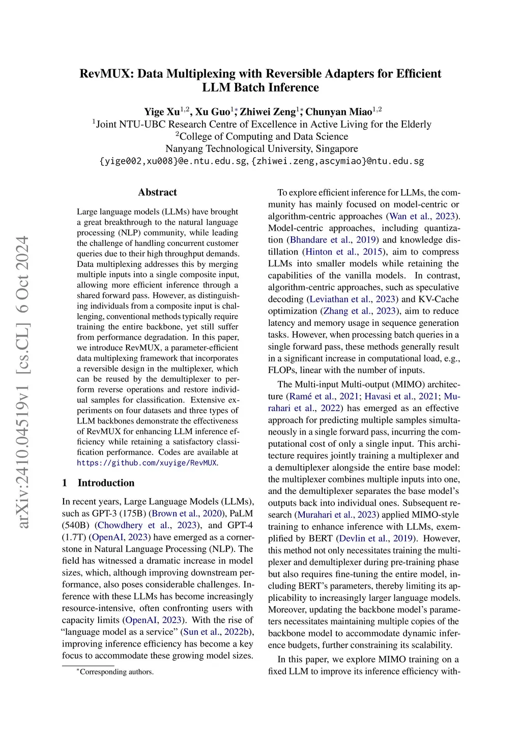 RevMUX: Data Multiplexing with Reversible Adapters for Efficient LLM