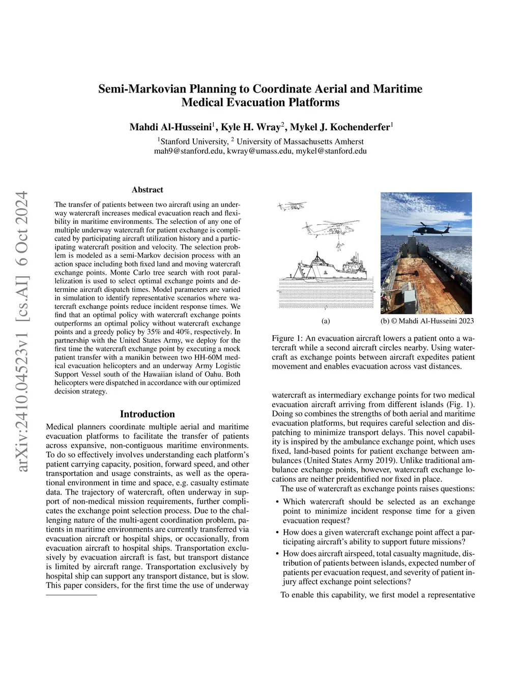 The transfer of patients between two aircraft using an underway watercraft increases medical evacuation reach and flexibility in maritime environments. The selection of any one of multiple underway watercraft for patient exchange is complicated by participating aircraft utilization history and a participating watercraft position and velocity. The selection problem is modeled as a semi-Markov decision process with an action space including both fixed land and moving watercraft exchange points. Monte Carlo tree search with root parallelization is used to select optimal exchange points and determine aircraft dispatch times. Model parameters are varied in simulation to identify representative scenarios where watercraft exchange points reduce incident response times. We find that an optimal policy with watercraft exchange points outperforms an optimal policy without watercraft exchange points and a greedy policy by 35% and 40%, respectively. In partnership with the United States Army, we deploy for the first time the watercraft exchange point by executing a mock patient transfer with a manikin between two HH-60M medical evacuation helicopters and an underway Army Logistic Support Vessel south of the Hawaiian island of Oahu. Both helicopters were dispatched in accordance with our optimized decision strategy.