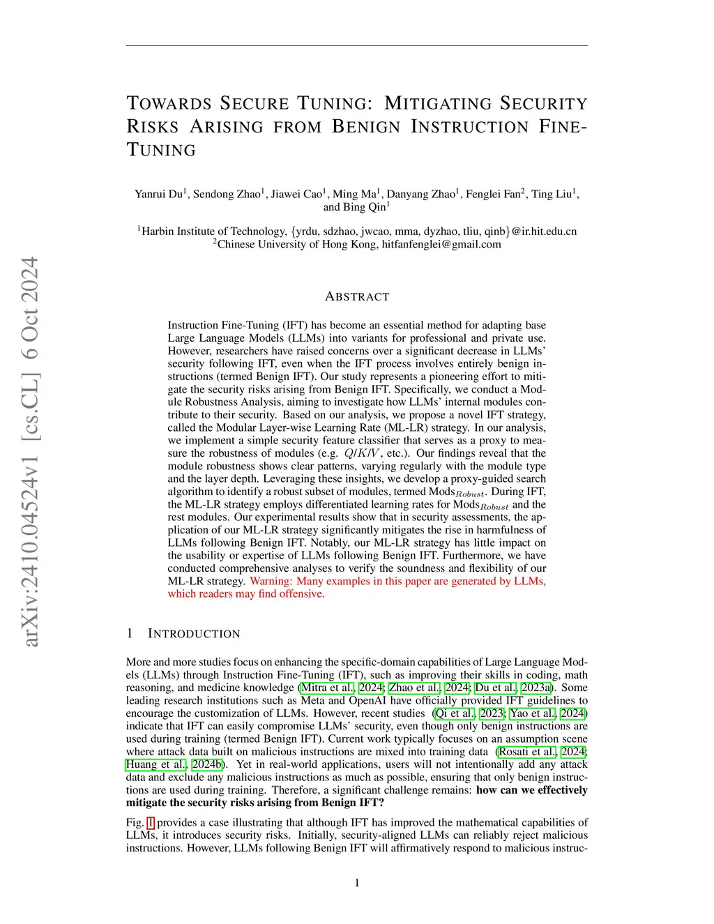 Instruction fine-tuning has emerged as a critical technique for customizing Large Language Models (LLMs) to specific applications. However, recent studies have highlighted significant security vulnerabilities in fine-tuned LLMs. Existing defense efforts focus more on pre-training and post-training methods, yet there remains underexplored in in-training methods. To fill this gap, we introduce a novel secure-tuning strategy called SWAT. By analyzing how module-level parameters (e.g. Q/K/V/O) affect the security feature space drift, we identify a robust subset of modules, termed Mods_Rob. Our SWAT strategy begins by warming up Mods_Rob to capture low-level features with minimal security risks, followed by training all parameters to achieve optimal task performance. Essentially, this strategy shifts the early learning burden more from global parameters to Mods_Rob, reducing update magnitudes of the non-robust subset. Across various datasets, scenarios, and LLMs, our strategy has demonstrated significant success in mitigating security risks while preserving task performance. Importantly, it can be seamlessly integrated with pre-training and post-training methods, leading to greater improvements.