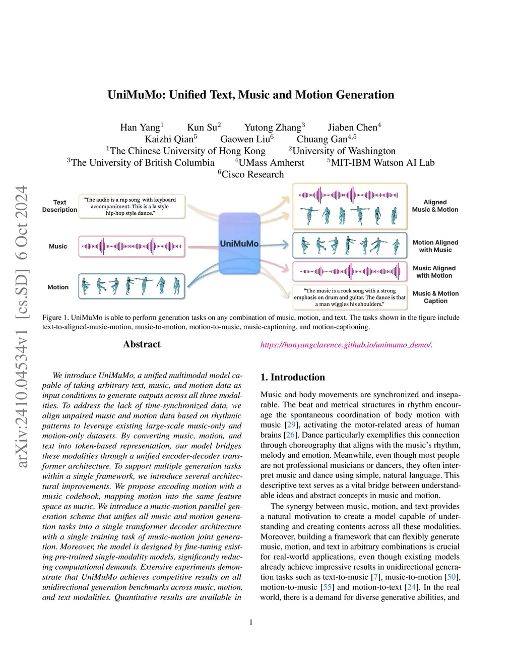 We introduce UniMuMo, a unified multimodal model capable of taking arbitrary text, music, and motion data as input conditions to generate outputs across all three modalities. To address the lack of time-synchronized data, we align unpaired music and motion data based on rhythmic patterns to leverage existing large-scale music-only and motion-only datasets. By converting music, motion, and text into token-based representation, our model bridges these modalities through a unified encoder-decoder transformer architecture. To support multiple generation tasks within a single framework, we introduce several architectural improvements. We propose encoding motion with a music codebook, mapping motion into the same feature space as music. We introduce a music-motion parallel generation scheme that unifies all music and motion generation tasks into a single transformer decoder architecture with a single training task of music-motion joint generation. Moreover, the model is designed by fine-tuning existing pre-trained single-modality models, significantly reducing computational demands. Extensive experiments demonstrate that UniMuMo achieves competitive results on all unidirectional generation benchmarks across music, motion, and text modalities. Quantitative results are available in the \href{https://hanyangclarence.github.io/unimumo_demo/}{project page}.