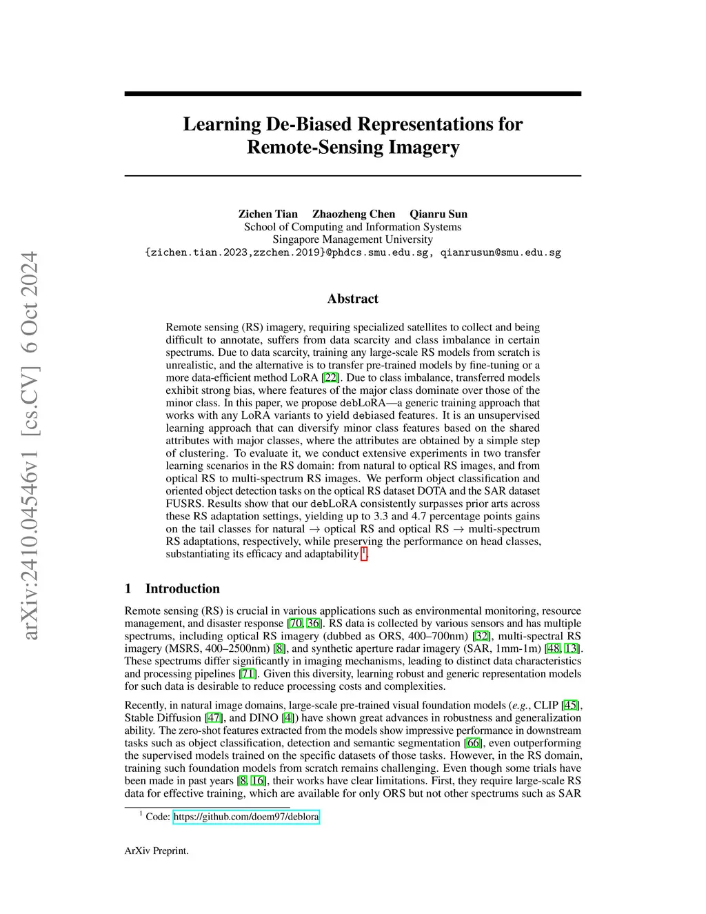 Remote sensing (RS) imagery, requiring specialized satellites to collect and being difficult to annotate, suffers from data scarcity and class imbalance in certain spectrums. Due to data scarcity, training any large-scale RS models from scratch is unrealistic, and the alternative is to transfer pre-trained models by fine-tuning or a more data-efficient method LoRA. Due to class imbalance, transferred models exhibit strong bias, where features of the major class dominate over those of the minor class. In this paper, we propose debLoRA, a generic training approach that works with any LoRA variants to yield debiased features. It is an unsupervised learning approach that can diversify minor class features based on the shared attributes with major classes, where the attributes are obtained by a simple step of clustering. To evaluate it, we conduct extensive experiments in two transfer learning scenarios in the RS domain: from natural to optical RS images, and from optical RS to multi-spectrum RS images. We perform object classification and oriented object detection tasks on the optical RS dataset DOTA and the SAR dataset FUSRS. Results show that our debLoRA consistently surpasses prior arts across these RS adaptation settings, yielding up to 3.3 and 4.7 percentage points gains on the tail classes for natural to optical RS and optical RS to multi-spectrum RS adaptations, respectively, while preserving the performance on head classes, substantiating its efficacy and adaptability.