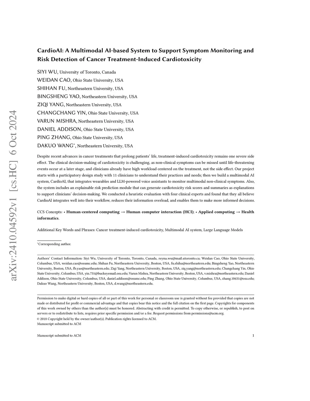 Despite recent advances in cancer treatments that prolong patients' lives, treatment-induced cardiotoxicity remains one severe side effect. The clinical decision-making of cardiotoxicity is challenging, as non-clinical symptoms can be missed until life-threatening events occur at a later stage, and clinicians already have a high workload centered on the treatment, not the side effects. Our project starts with a participatory design study with 11 clinicians to understand their practices and needs; then we build a multimodal AI system, CardioAI, that integrates wearables and LLM-powered voice assistants to monitor multimodal non-clinical symptoms. Also, the system includes an explainable risk prediction module that can generate cardiotoxicity risk scores and summaries as explanations to support clinicians' decision-making. We conducted a heuristic evaluation with four clinical experts and found that they all believe CardioAI integrates well into their workflow, reduces their information overload, and enables them to make more informed decisions.