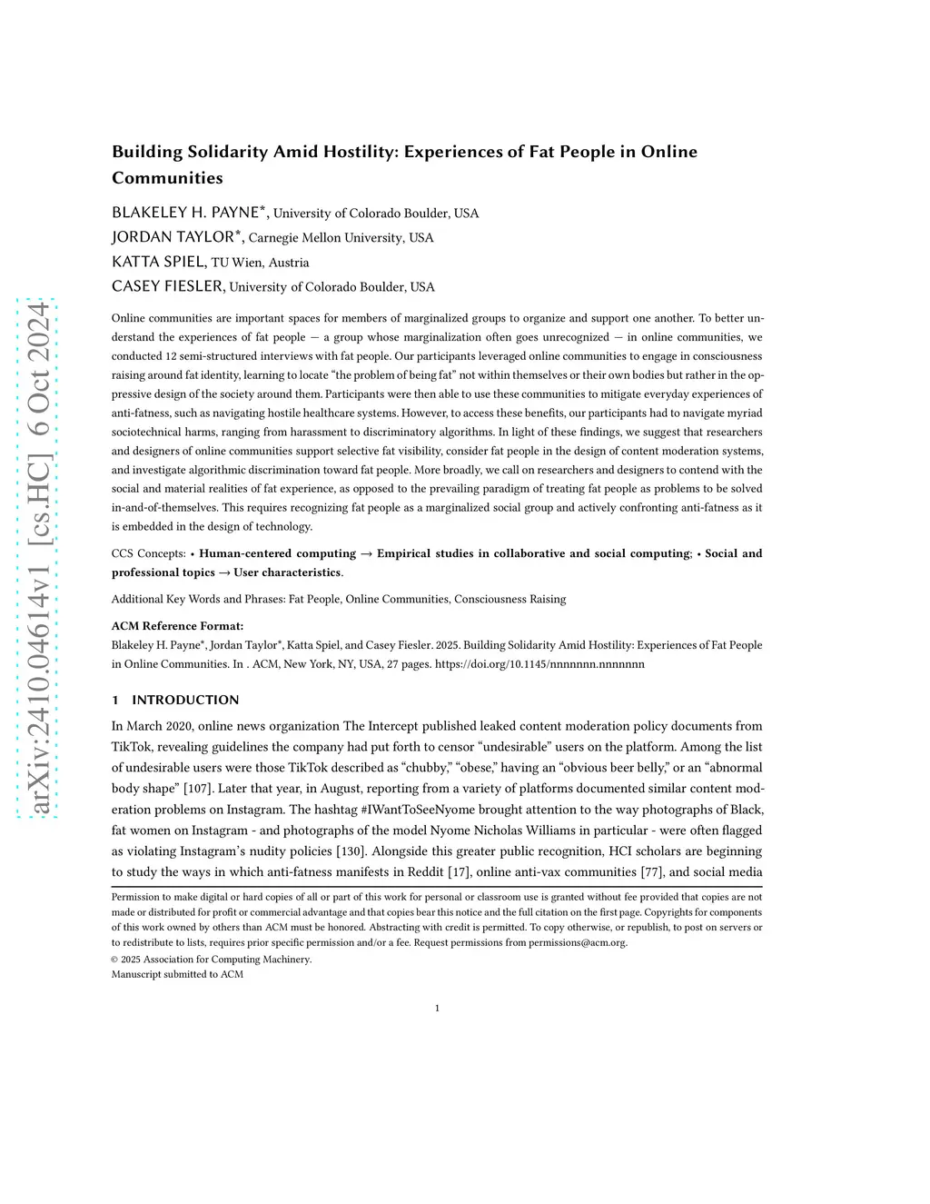 Building Solidarity Amid Hostility: Experiences of Fat People in Online