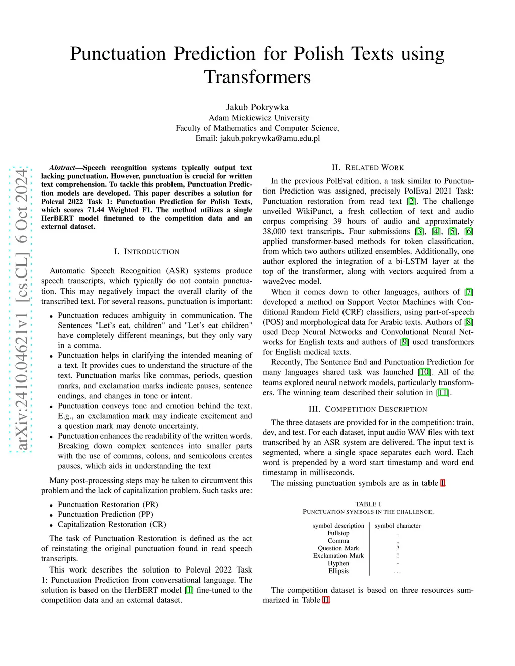 Speech recognition systems typically output text lacking punctuation. However, punctuation is crucial for written text comprehension. To tackle this problem, Punctuation Prediction models are developed. This paper describes a solution for Poleval 2022 Task 1: Punctuation Prediction for Polish Texts, which scores 71.44 Weighted F1. The method utilizes a single HerBERT model finetuned to the competition data and an external dataset.