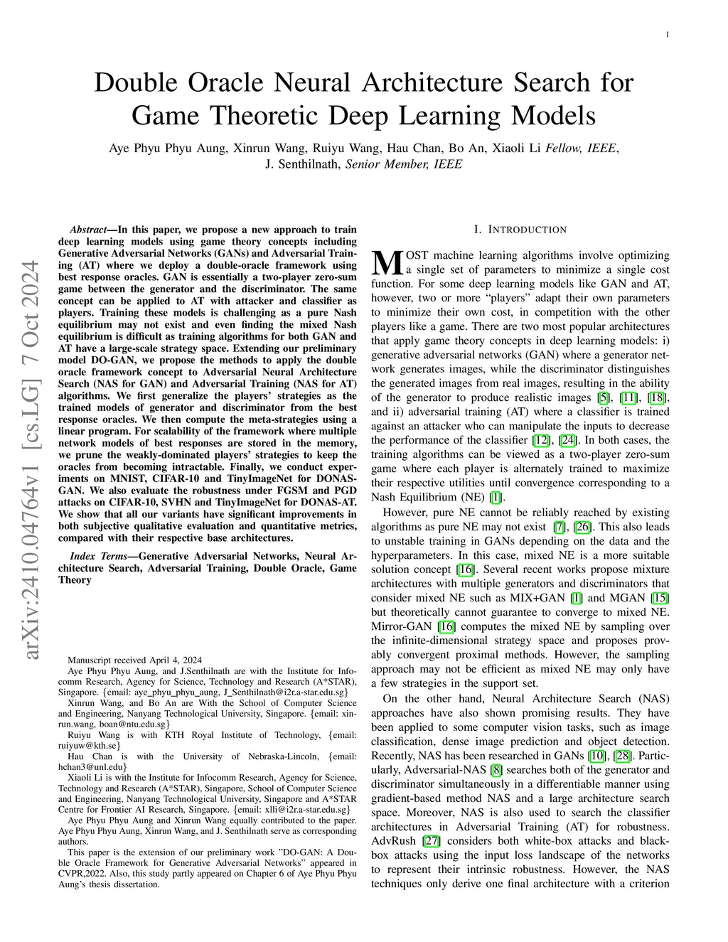 In this paper, we propose a new approach to train deep learning models using game theory concepts including Generative Adversarial Networks (GANs) and Adversarial Training (AT) where we deploy a double-oracle framework using best response oracles. GAN is essentially a two-player zero-sum game between the generator and the discriminator. The same concept can be applied to AT with attacker and classifier as players. Training these models is challenging as a pure Nash equilibrium may not exist and even finding the mixed Nash equilibrium is difficult as training algorithms for both GAN and AT have a large-scale strategy space. Extending our preliminary model DO-GAN, we propose the methods to apply the double oracle framework concept to Adversarial Neural Architecture Search (NAS for GAN) and Adversarial Training (NAS for AT) algorithms. We first generalize the players' strategies as the trained models of generator and discriminator from the best response oracles. We then compute the meta-strategies using a linear program. For scalability of the framework where multiple network models of best responses are stored in the memory, we prune the weakly-dominated players' strategies to keep the oracles from becoming intractable. Finally, we conduct experiments on MNIST, CIFAR-10 and TinyImageNet for DONAS-GAN. We also evaluate the robustness under FGSM and PGD attacks on CIFAR-10, SVHN and TinyImageNet for DONAS-AT. We show that all our variants have significant improvements in both subjective qualitative evaluation and quantitative metrics, compared with their respective base architectures.