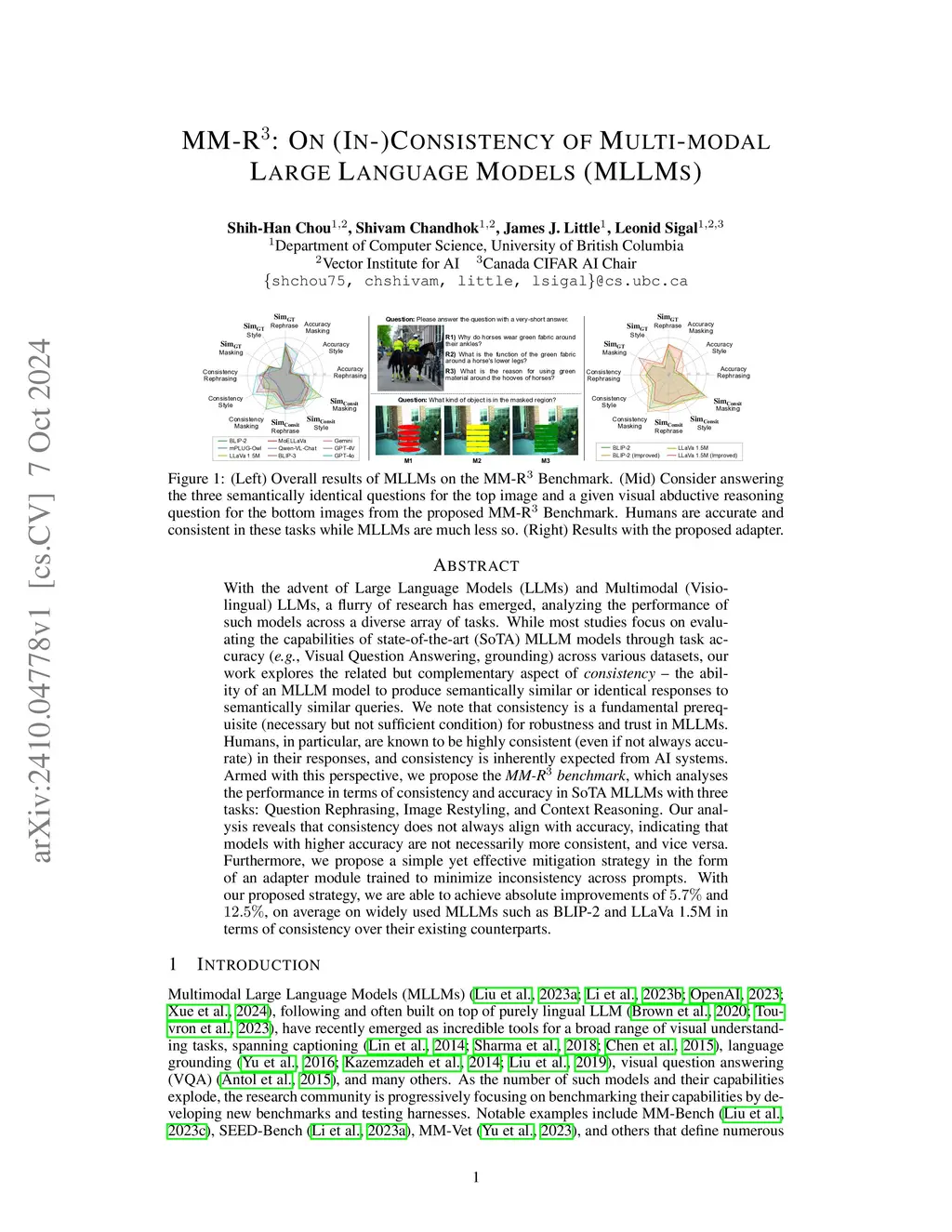 With the advent of LLMs and variants, a flurry of research has emerged, analyzing the performance of such models across an array of tasks. While most studies focus on evaluating the capabilities of state-of-the-art (SoTA) Vision Language Models (VLMs) through task accuracy (e.g., visual question answering, grounding), our work explores the related but complementary aspect of consistency - the ability of a VLM to produce semantically similar or identical responses to semantically similar queries. We note that consistency is a fundamental prerequisite (necessary but not sufficient condition) for robustness and trust in VLMs. Armed with this perspective, we propose the MM-R3 benchmark, which allows us to analyze performance, in terms of consistency and accuracy, of SoTA VLMs on three tasks: Question Rephrasing, Image Restyling, and Context Reasoning. Our analysis reveals that consistency does not always align with accuracy, indicating that models with higher accuracy are not necessarily more consistent, and vice versa. Furthermore, we propose a simple yet effective mitigation strategy in the form of an adapter module trained to minimize inconsistency across prompts. With our proposed strategy, we are able to achieve absolute improvements of 5.7% and 12.5%, on average on widely used VLMs such as BLIP-2 and LLaVa 1.5M in terms of consistency over their existing counterparts.