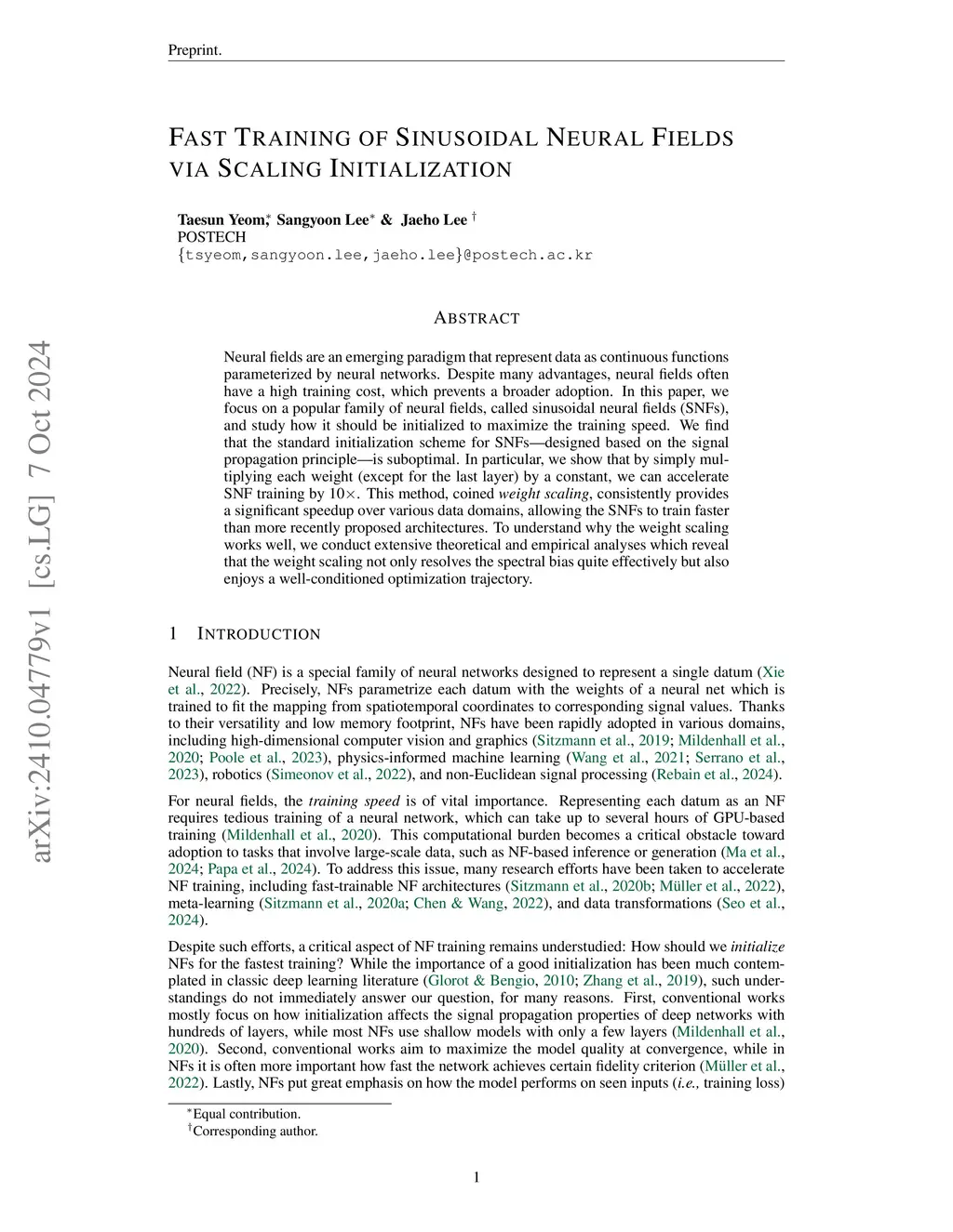 Neural fields are an emerging paradigm that represent data as continuous functions parameterized by neural networks. Despite many advantages, neural fields often have a high training cost, which prevents a broader adoption. In this paper, we focus on a popular family of neural fields, called sinusoidal neural fields (SNFs), and study how it should be initialized to maximize the training speed. We find that the standard initialization scheme for SNFs -- designed based on the signal propagation principle -- is suboptimal. In particular, we show that by simply multiplying each weight (except for the last layer) by a constant, we can accelerate SNF training by 10. This method, coined , consistently provides a significant speedup over various data domains, allowing the SNFs to train faster than more recently proposed architectures. To understand why the weight scaling works well, we conduct extensive theoretical and empirical analyses which reveal that the weight scaling not only resolves the spectral bias quite effectively but also enjoys a well-conditioned optimization trajectory. The code is available .