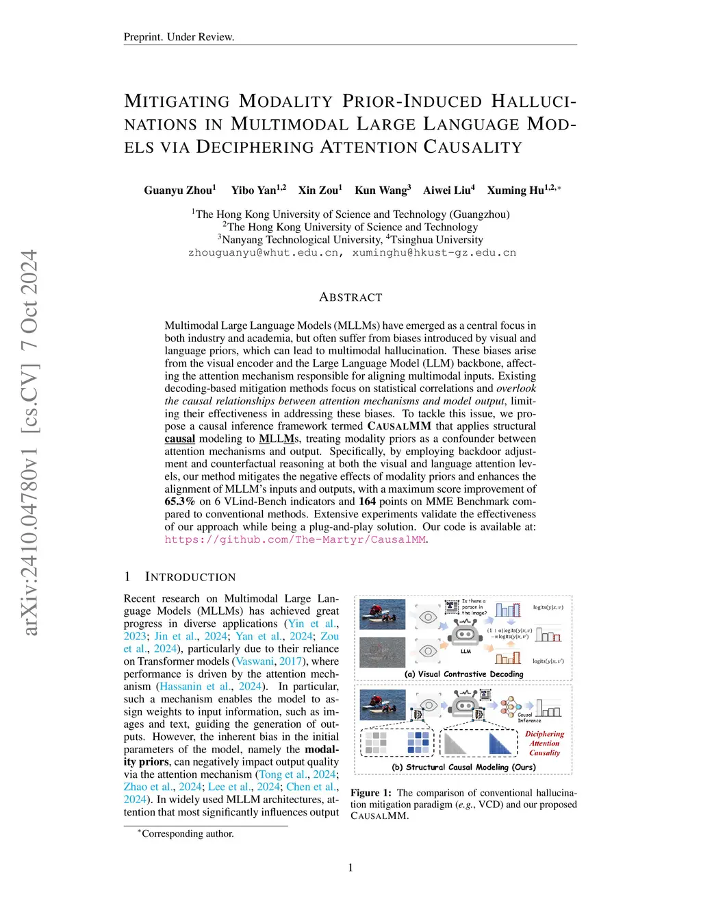 Multimodal Large Language Models (MLLMs) have emerged as a central focus in both industry and academia, but often suffer from biases introduced by visual and language priors, which can lead to multimodal hallucination. These biases arise from the visual encoder and the Large Language Model (LLM) backbone, affecting the attention mechanism responsible for aligning multimodal inputs. Existing decoding-based mitigation methods focus on statistical correlations and overlook the causal relationships between attention mechanisms and model output, limiting their effectiveness in addressing these biases. To tackle this issue, we propose a causal inference framework termed CausalMM that applies structural causal modeling to MLLMs, treating modality priors as a confounder between attention mechanisms and output. Specifically, by employing backdoor adjustment and counterfactual reasoning at both the visual and language attention levels, our method mitigates the negative effects of modality priors and enhances the alignment of MLLM's inputs and outputs, with a maximum score improvement of 65.3% on 6 VLind-Bench indicators and 164 points on MME Benchmark compared to conventional methods. Extensive experiments validate the effectiveness of our approach while being a plug-and-play solution. Our code is available at: https://github.com/The-Martyr/CausalMM