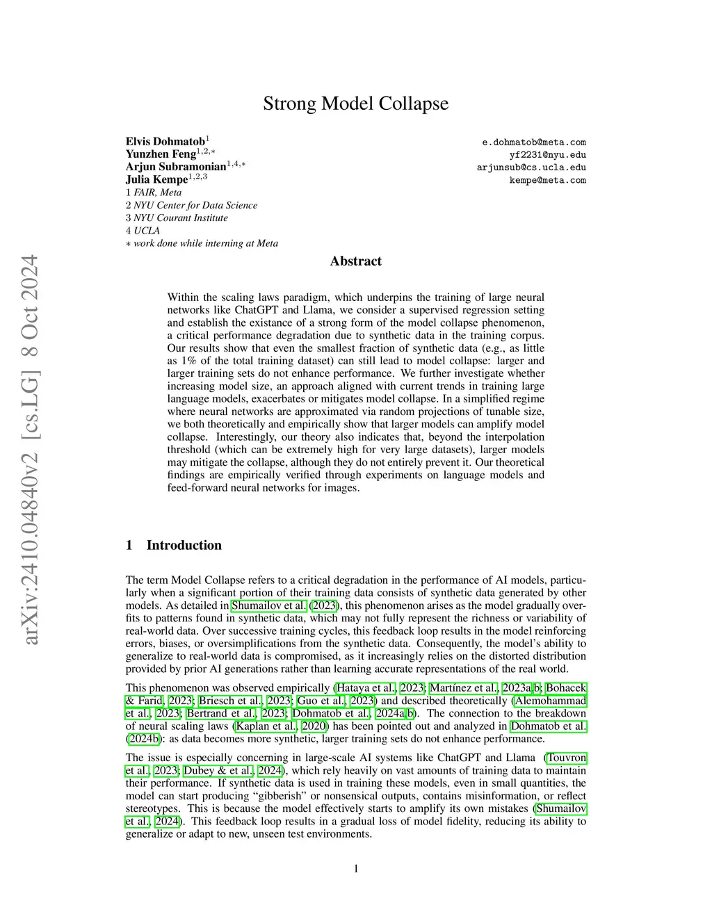 Within the scaling laws paradigm, which underpins the training of large neural networks like ChatGPT and Llama, we consider a supervised regression setting and establish the existance of a strong form of the model collapse phenomenon, a critical performance degradation due to synthetic data in the training corpus. Our results show that even the smallest fraction of synthetic data (e.g., as little as 1\% of the total training dataset) can still lead to model collapse: larger and larger training sets do not enhance performance. We further investigate whether increasing model size, an approach aligned with current trends in training large language models, exacerbates or mitigates model collapse. In a simplified regime where neural networks are approximated via random projections of tunable size, we both theoretically and empirically show that larger models can amplify model collapse. Interestingly, our theory also indicates that, beyond the interpolation threshold (which can be extremely high for very large datasets), larger models may mitigate the collapse, although they do not entirely prevent it. Our theoretical findings are empirically verified through experiments on language models and feed-forward neural networks for images.