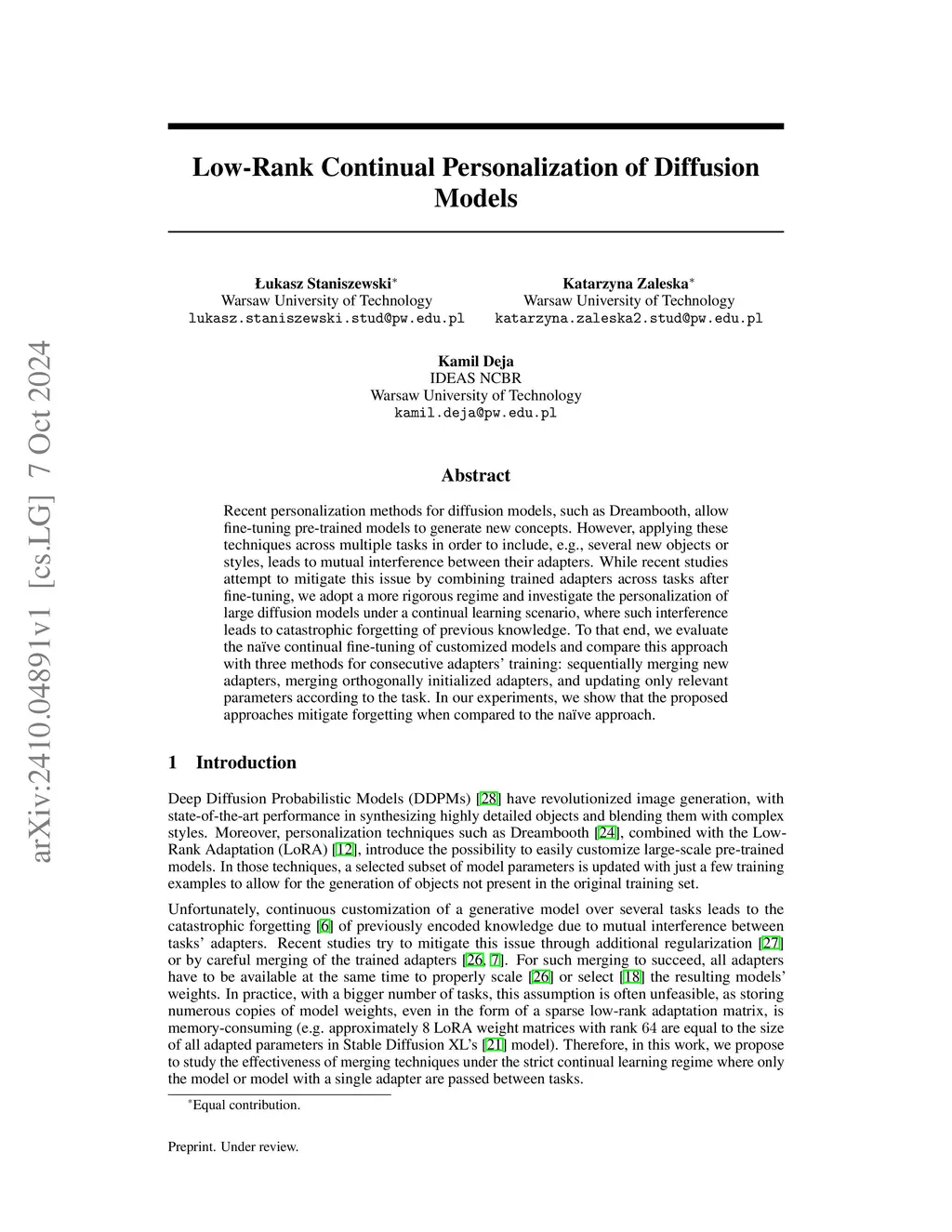 Recent personalization methods for diffusion models, such as Dreambooth and LoRA, allow fine-tuning pre-trained models to generate new concepts. However, applying these techniques across consecutive tasks in order to include, e.g., new objects or styles, leads to a forgetting of previous knowledge due to mutual interference between their adapters. In this work, we tackle the problem of continual customization under a rigorous regime with no access to past tasks' adapters. In such a scenario, we investigate how different adapters' initialization and merging methods can improve the quality of the final model. To that end, we evaluate the naive continual fine-tuning of customized models and compare this approach with three methods for consecutive adapters' training: sequentially merging new adapters, merging orthogonally initialized adapters, and updating only relevant task-specific weights. In our experiments, we show that the proposed techniques mitigate forgetting when compared to the naive approach. In our studies, we show different traits of selected techniques and their effect on the plasticity and stability of the continually adapted model. Repository with the code is available atthis https URL.