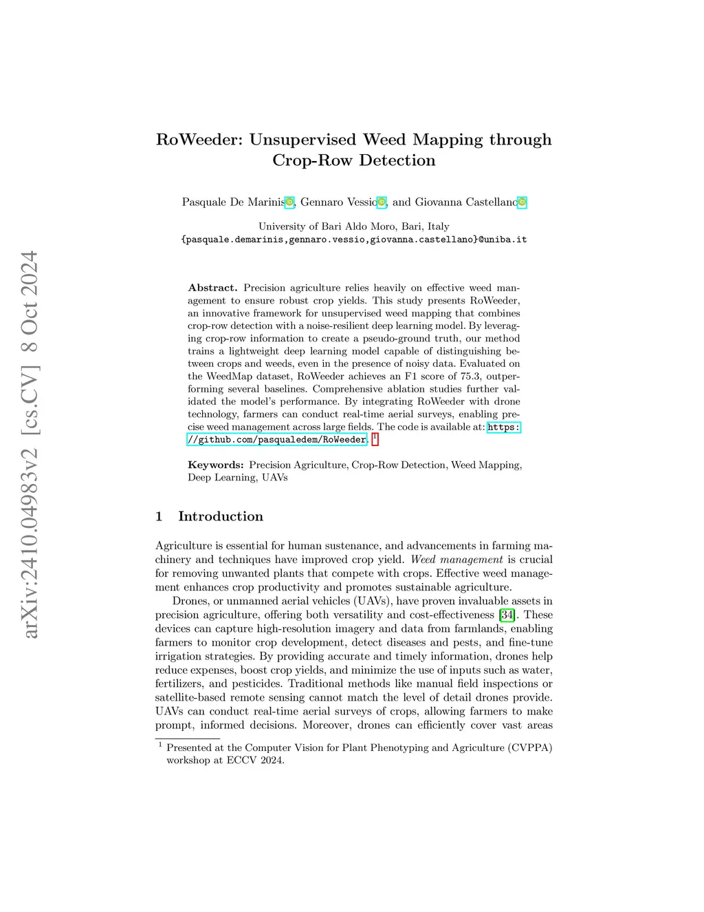 Precision agriculture relies heavily on effective weed management to ensure robust crop yields. This study presents RoWeeder, an innovative framework for unsupervised weed mapping that combines crop-row detection with a noise-resilient deep learning model. By leveraging crop-row information to create a pseudo-ground truth, our method trains a lightweight deep learning model capable of distinguishing between crops and weeds, even in the presence of noisy data. Evaluated on the WeedMap dataset, RoWeeder achieves an F1 score of 75.3, outperforming several baselines. Comprehensive ablation studies further validated the model's performance. By integrating RoWeeder with drone technology, farmers can conduct real-time aerial surveys, enabling precise weed management across large fields. The code is available at: \url{https://github.com/pasqualedem/RoWeeder}.