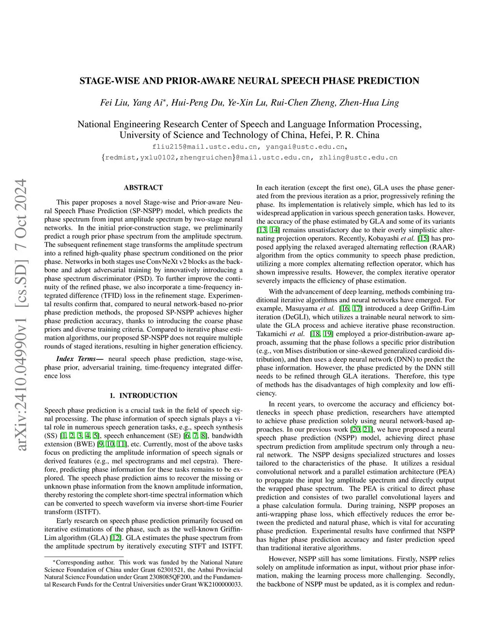 This paper proposes a novel Stage-wise and Prior-aware Neural Speech Phase Prediction (SP-NSPP) model, which predicts the phase spectrum from input amplitude spectrum by two-stage neural networks. In the initial prior-construction stage, we preliminarily predict a rough prior phase spectrum from the amplitude spectrum. The subsequent refinement stage transforms the amplitude spectrum into a refined high-quality phase spectrum conditioned on the prior phase. Networks in both stages use ConvNeXt v2 blocks as the backbone and adopt adversarial training by innovatively introducing a phase spectrum discriminator (PSD). To further improve the continuity of the refined phase, we also incorporate a time-frequency integrated difference (TFID) loss in the refinement stage. Experimental results confirm that, compared to neural network-based no-prior phase prediction methods, the proposed SP-NSPP achieves higher phase prediction accuracy, thanks to introducing the coarse phase priors and diverse training criteria. Compared to iterative phase estimation algorithms, our proposed SP-NSPP does not require multiple rounds of staged iterations, resulting in higher generation efficiency.