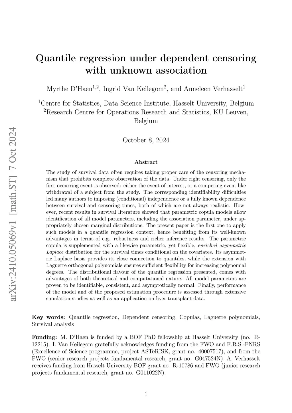 The study of survival data often requires taking proper care of the censoring mechanism that prohibits complete observation of the data. Under right censoring, only the first occurring event is observed: either the event of interest, or a competing event like withdrawal of a subject from the study. The corresponding identifiability difficulties led many authors to imposing (conditional) independence or a fully known dependence between survival and censoring times, both of which are not always realistic. However, recent results in survival literature showed that parametric copula models allow identification of all model parameters, including the association parameter, under appropriately chosen marginal distributions. The present paper is the first one to apply such models in a quantile regression context, hence benefiting from its well-known advantages in terms of e.g. robustness and richer inference results. The parametric copula is supplemented with a likewise parametric, yet flexible, enriched asymmetric Laplace distribution for the survival times conditional on the covariates. Its asymmetric Laplace basis provides its close connection to quantiles, while the extension with Laguerre orthogonal polynomials ensures sufficient flexibility for increasing polynomial degrees. The distributional flavour of the quantile regression presented, comes with advantages of both theoretical and computational nature. All model parameters are proven to be identifiable, consistent, and asymptotically normal. Finally, performance of the model and of the proposed estimation procedure is assessed through extensive simulation studies as well as an application on liver transplant data.