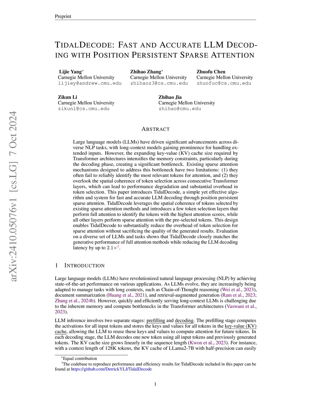 Large language models (LLMs) have driven significant advancements across diverse NLP tasks, with long-context models gaining prominence for handling extended inputs. However, the expanding key-value (KV) cache size required by Transformer architectures intensifies the memory constraints, particularly during the decoding phase, creating a significant bottleneck. Existing sparse attention mechanisms designed to address this bottleneck have two limitations: (1) they often fail to reliably identify the most relevant tokens for attention, and (2) they overlook the spatial coherence of token selection across consecutive Transformer layers, which can lead to performance degradation and substantial overhead in token selection. This paper introduces TidalDecode, a simple yet effective algorithm and system for fast and accurate LLM decoding through position persistent sparse attention. TidalDecode leverages the spatial coherence of tokens selected by existing sparse attention methods and introduces a few token selection layers that perform full attention to identify the tokens with the highest attention scores, while all other layers perform sparse attention with the pre-selected tokens. This design enables TidalDecode to substantially reduce the overhead of token selection for sparse attention without sacrificing the quality of the generated results. Evaluation on a diverse set of LLMs and tasks shows that TidalDecode closely matches the generative performance of full attention methods while reducing the LLM decoding latency by up to 2.1x.