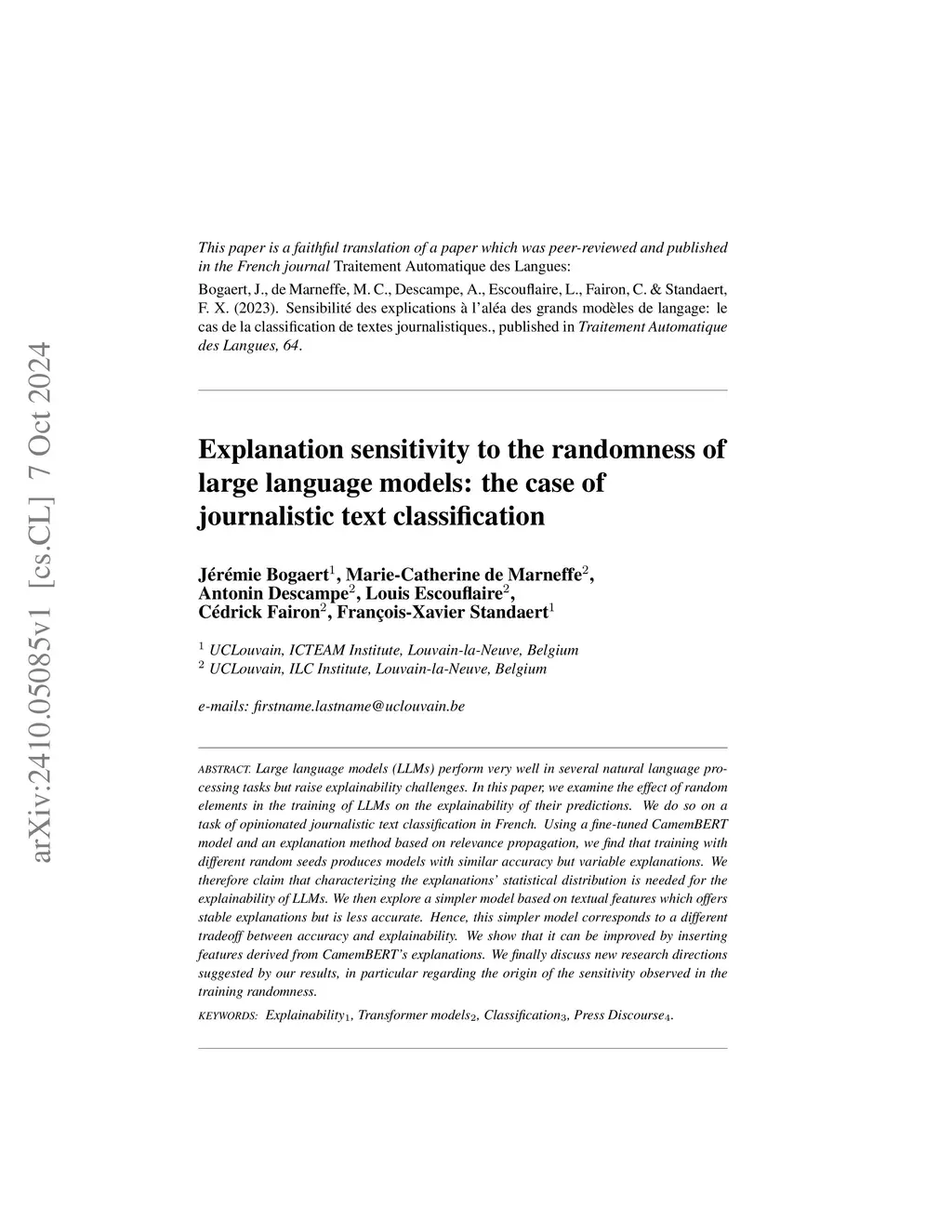 Large language models (LLMs) perform very well in several natural language processing tasks but raise explainability challenges. In this paper, we examine the effect of random elements in the training of LLMs on the explainability of their predictions. We do so on a task of opinionated journalistic text classification in French. Using a fine-tuned CamemBERT model and an explanation method based on relevance propagation, we find that training with different random seeds produces models with similar accuracy but variable explanations. We therefore claim that characterizing the explanations' statistical distribution is needed for the explainability of LLMs. We then explore a simpler model based on textual features which offers stable explanations but is less accurate. Hence, this simpler model corresponds to a different tradeoff between accuracy and explainability. We show that it can be improved by inserting features derived from CamemBERT's explanations. We finally discuss new research directions suggested by our results, in particular regarding the origin of the sensitivity observed in the training randomness.