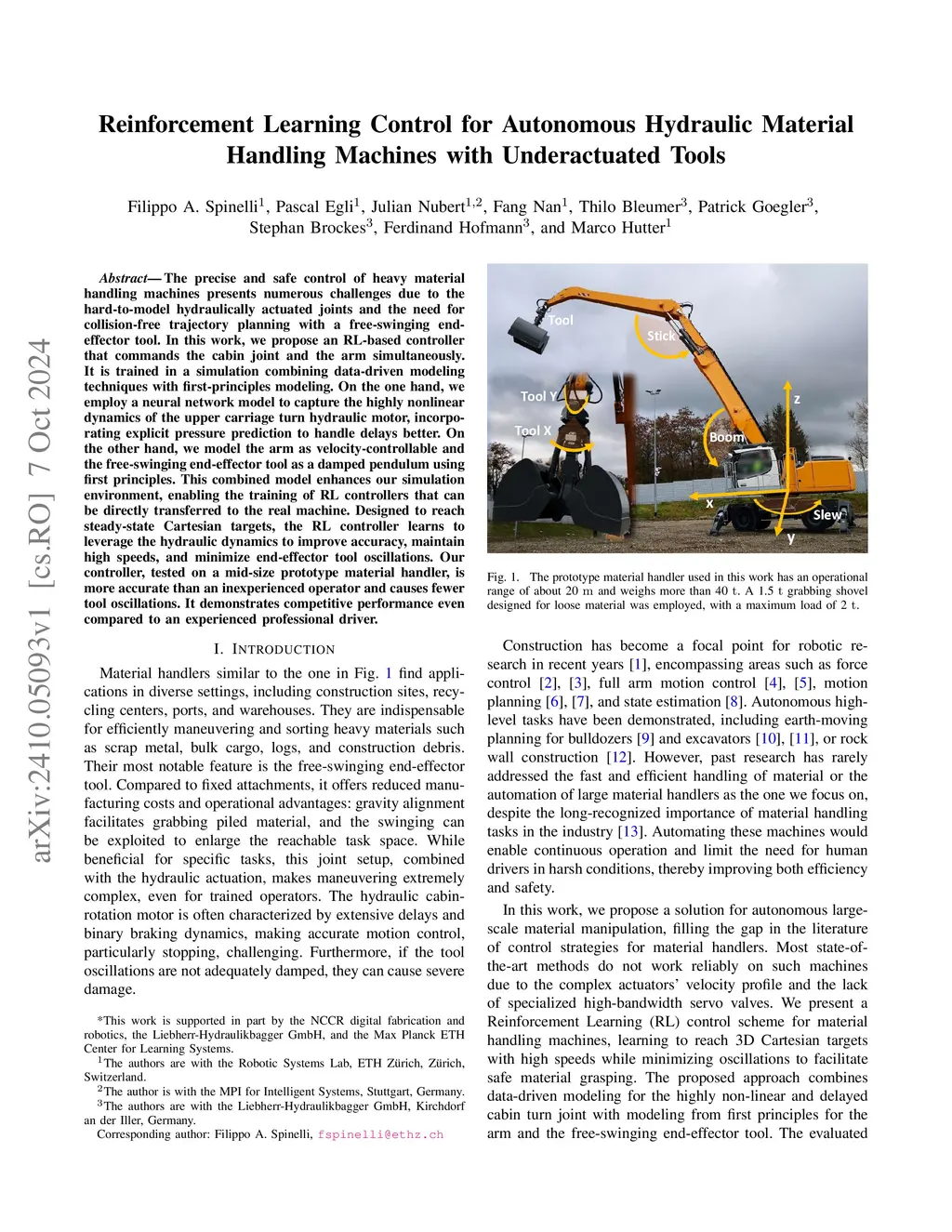 The precise and safe control of heavy material handling machines presents numerous challenges due to the hard-to-model hydraulically actuated joints and the need for collision-free trajectory planning with a free-swinging end-effector tool. In this work, we propose an RL-based controller that commands the cabin joint and the arm simultaneously. It is trained in a simulation combining data-driven modeling techniques with first-principles modeling. On the one hand, we employ a neural network model to capture the highly nonlinear dynamics of the upper carriage turn hydraulic motor, incorporating explicit pressure prediction to handle delays better. On the other hand, we model the arm as velocity-controllable and the free-swinging end-effector tool as a damped pendulum using first principles. This combined model enhances our simulation environment, enabling the training of RL controllers that can be directly transferred to the real machine. Designed to reach steady-state Cartesian targets, the RL controller learns to leverage the hydraulic dynamics to improve accuracy, maintain high speeds, and minimize end-effector tool oscillations. Our controller, tested on a mid-size prototype material handler, is more accurate than an inexperienced operator and causes fewer tool oscillations. It demonstrates competitive performance even compared to an experienced professional driver.
