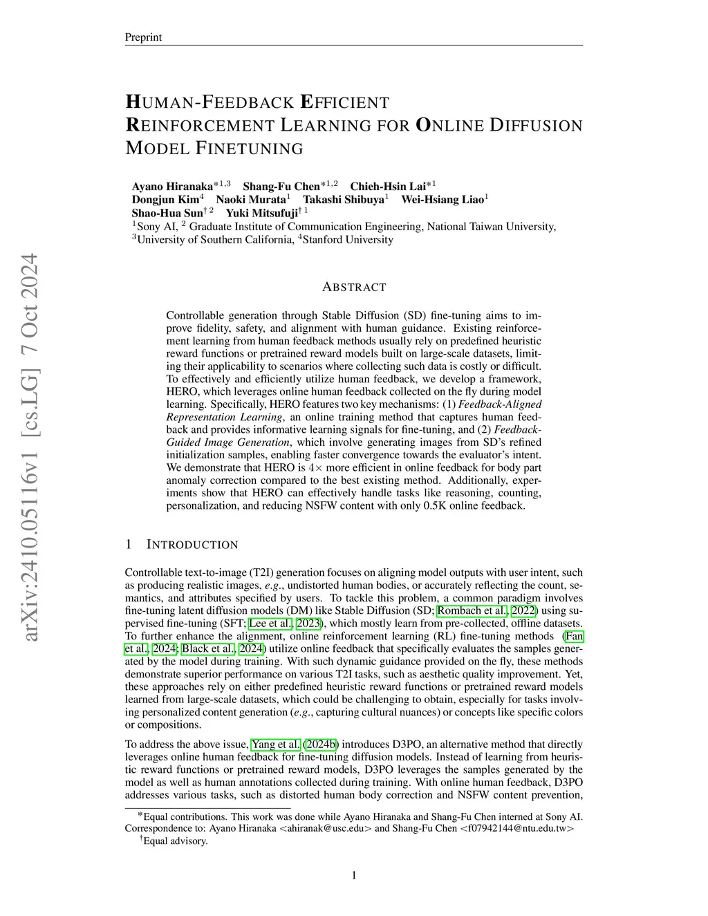 Controllable generation through Stable Diffusion (SD) fine-tuning aims to improve fidelity, safety, and alignment with human guidance. Existing reinforcement learning from human feedback methods usually rely on predefined heuristic reward functions or pretrained reward models built on large-scale datasets, limiting their applicability to scenarios where collecting such data is costly or difficult. To effectively and efficiently utilize human feedback, we develop a framework, HERO, which leverages online human feedback collected on the fly during model learning. Specifically, HERO features two key mechanisms: (1) Feedback-Aligned Representation Learning, an online training method that captures human feedback and provides informative learning signals for fine-tuning, and (2) Feedback-Guided Image Generation, which involves generating images from SD's refined initialization samples, enabling faster convergence towards the evaluator's intent. We demonstrate that HERO is 4x more efficient in online feedback for body part anomaly correction compared to the best existing method. Additionally, experiments show that HERO can effectively handle tasks like reasoning, counting, personalization, and reducing NSFW content with only 0.5K online feedback. The code and project page are available atthis https URL.