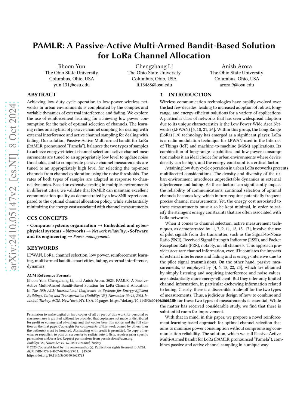 Achieving low duty cycle operation in low-power wireless networks in urban environments is complicated by the complex and variable dynamics of external interference and fading. We explore the use of reinforcement learning for achieving low power consumption for the task of optimal selection of channels. The learning relies on a hybrid of passive channel sampling for dealing with external interference and active channel sampling for dealing with fading. Our solution, Passive-Active Multi-armed bandit for LoRa (PAMLR, pronounced "Pamela"), balances the two types of samples to achieve energy-efficient channel selection: active channel measurements are tuned to an appropriately low level to update noise thresholds, and to compensate passive channel measurements are tuned to an appropriately high level for selecting the top-most channels from channel exploration using the noise thresholds. The rates of both types of samples are adapted in response to channel dynamics. Based on extensive testing in multiple environments in different cities, we validate that PAMLR can maintain excellent communication quality, as demonstrated by a low SNR regret compared to the optimal channel allocation policy, while substantially minimizing the energy cost associated with channel measurements.