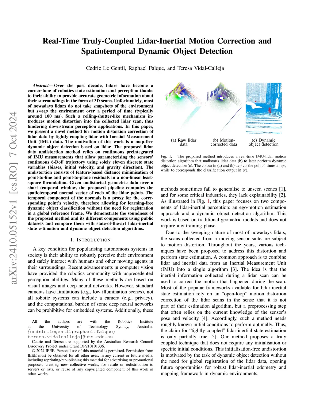 Over the past decade, lidars have become a cornerstone of robotics state estimation and perception thanks to their ability to provide accurate geometric information about their surroundings in the form of 3D scans. Unfortunately, most of nowadays lidars do not take snapshots of the environment but sweep the environment over a period of time (typically around 100 ms). Such a rolling-shutter-like mechanism introduces motion distortion into the collected lidar scan, thus hindering downstream perception applications. In this paper, we present a novel method for motion distortion correction of lidar data by tightly coupling lidar with Inertial Measurement Unit (IMU) data. The motivation of this work is a map-free dynamic object detection based on lidar. The proposed lidar data undistortion method relies on continuous preintegrated of IMU measurements that allow parameterising the sensors' continuous 6-DoF trajectory using solely eleven discrete state variables (biases, initial velocity, and gravity direction). The undistortion consists of feature-based distance minimisation of point-to-line and point-to-plane residuals in a non-linear least-square formulation. Given undistorted geometric data over a short temporal window, the proposed pipeline computes the spatiotemporal normal vector of each of the lidar points. The temporal component of the normals is a proxy for the corresponding point's velocity, therefore allowing for learning-free dynamic object classification without the need for registration in a global reference frame. We demonstrate the soundness of the proposed method and its different components using public datasets and compare them with state-of-the-art lidar-inertial state estimation and dynamic object detection algorithms.